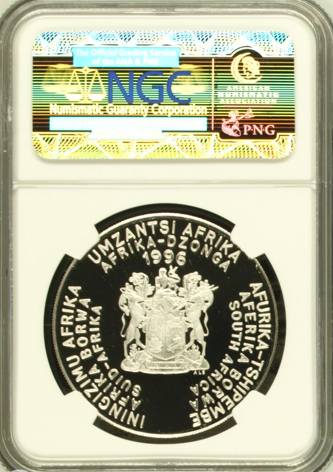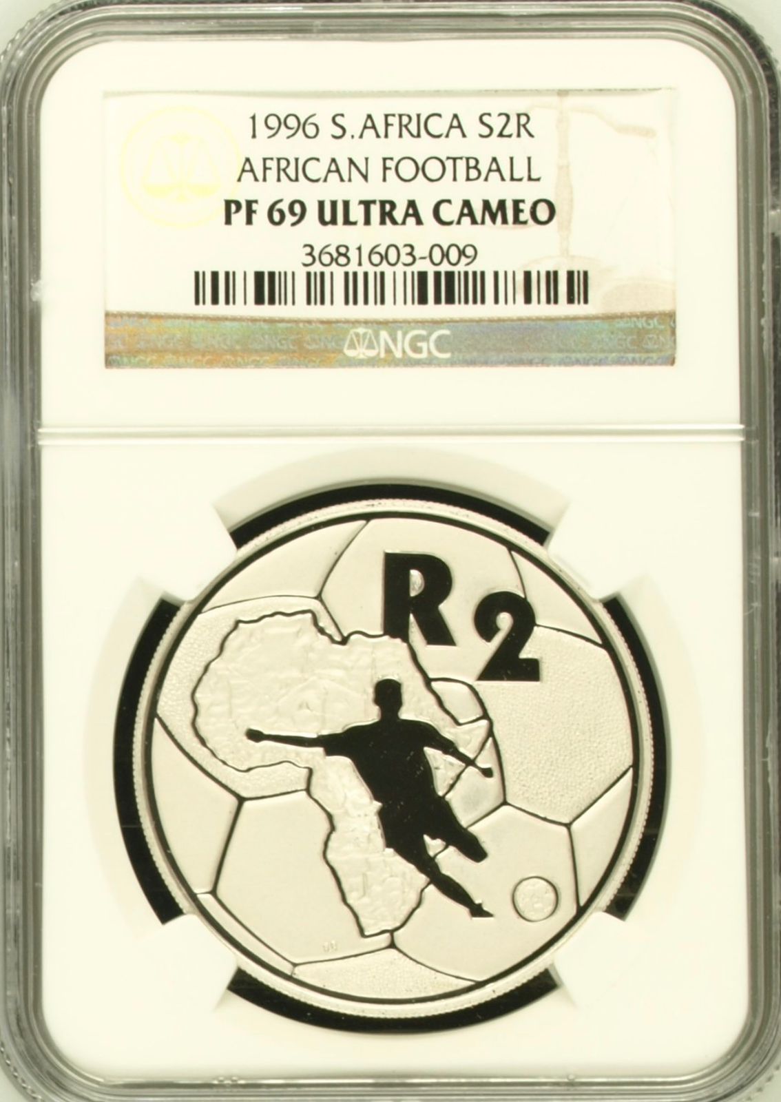 Lot 35: South Africa: Republic 1oz Silver R2 “African Football” of 1996 Proof 69 Ultra Cameo NGC.