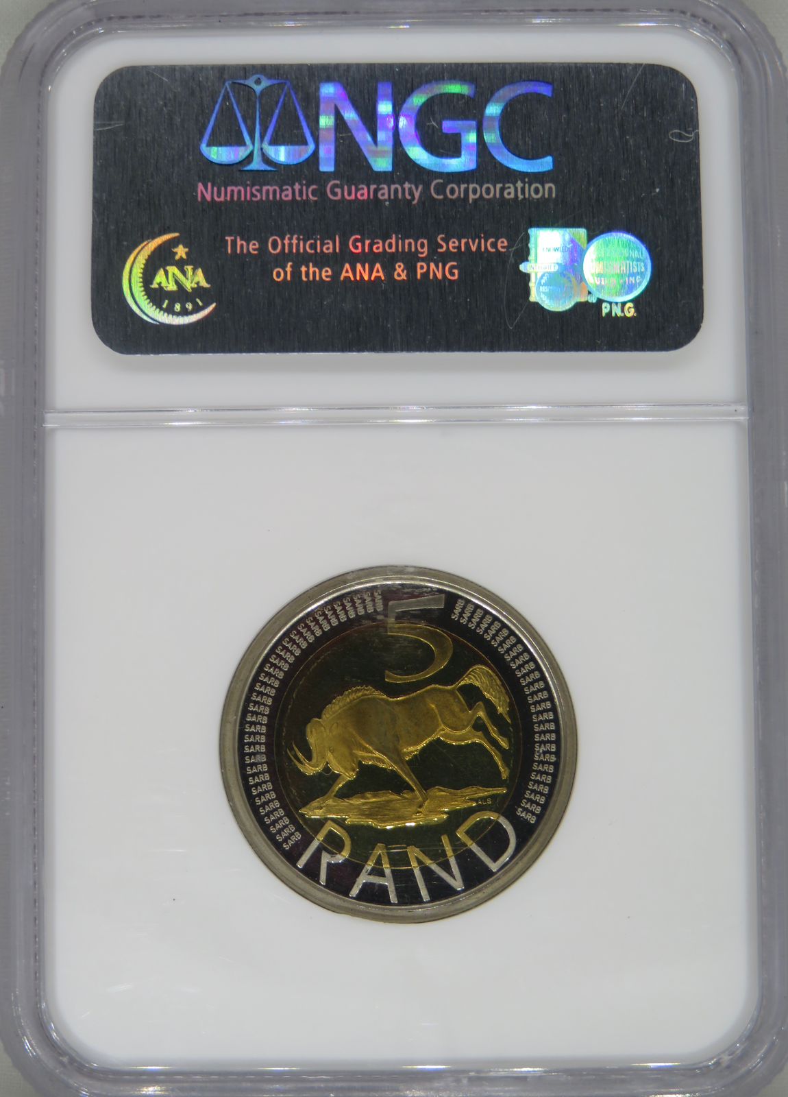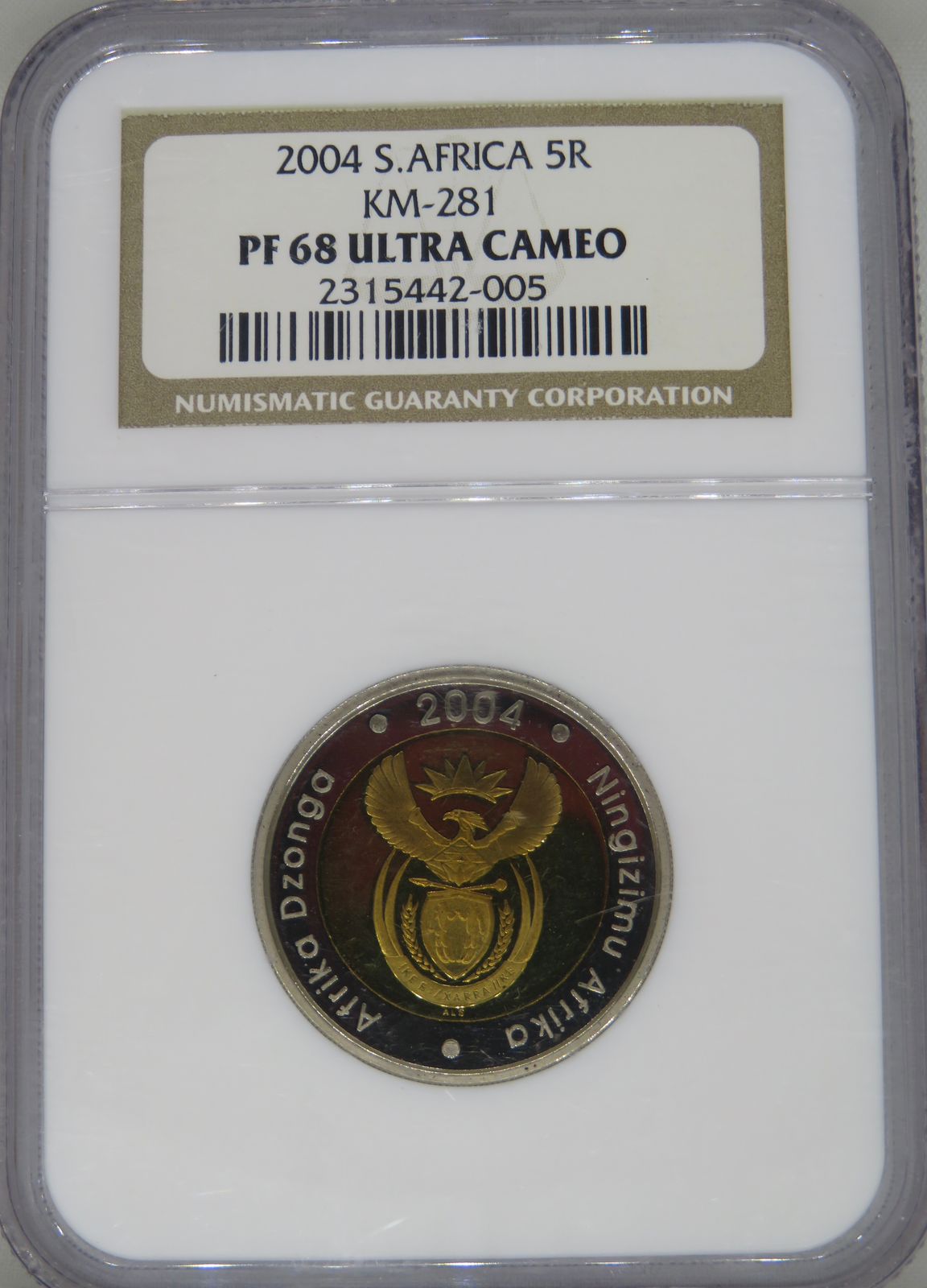 South Africa: Republic nickel plated copper R5 of 2004 Proof 68 NGC.