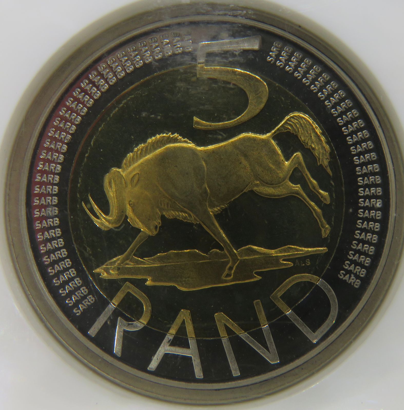 Lot 35: South Africa: Republic nickel plated copper R5 of 2004 Proof 68 NGC.
