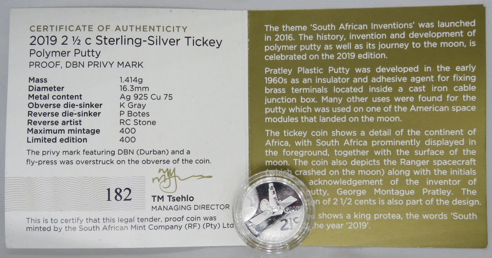 South Africa: Republic Silver 2.5 cents Flypress Tickey – Polymer Putty Durban Privy Mark of 2019.