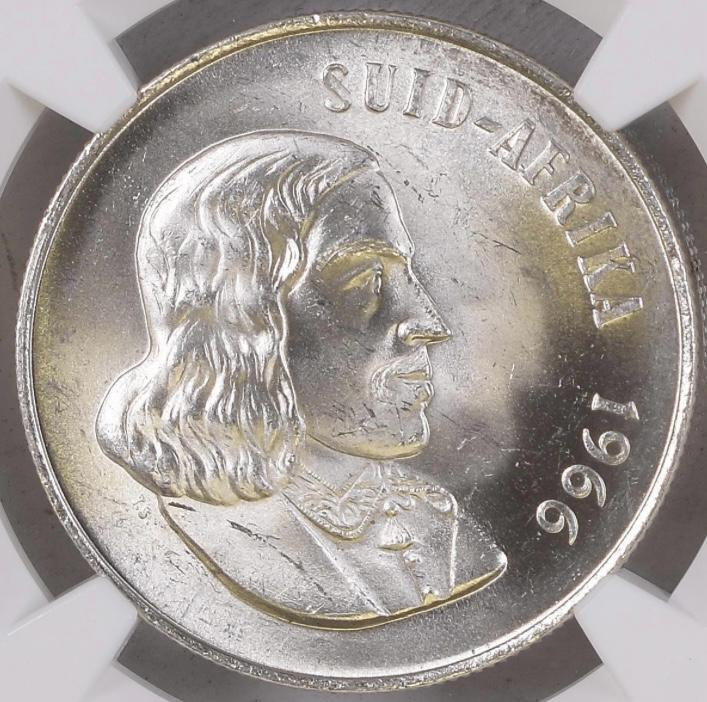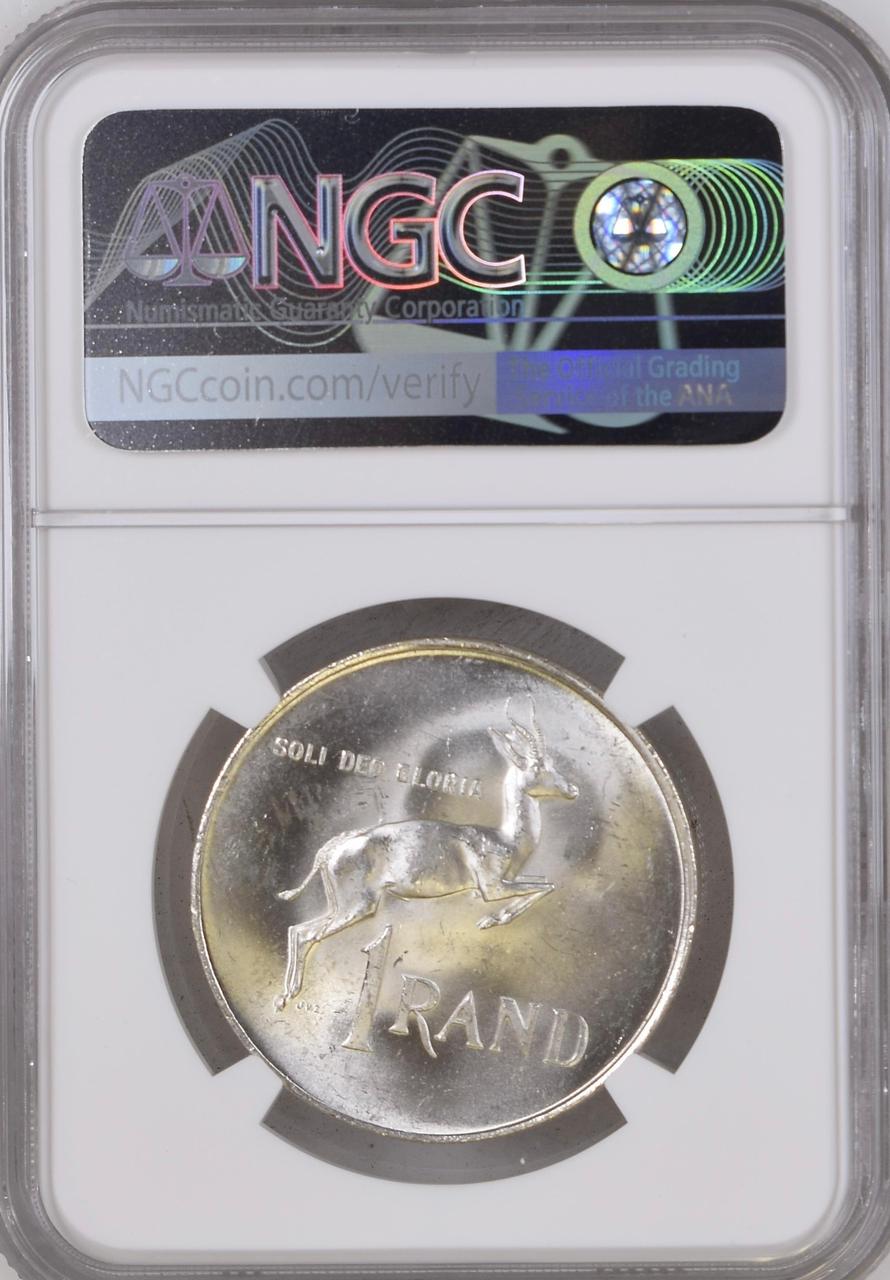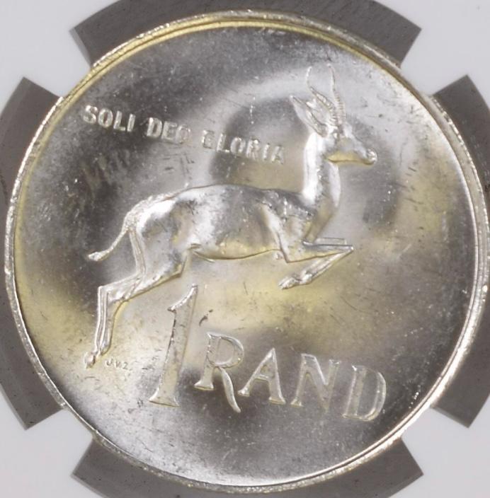 South Africa: Republic Silver R1 “Afrikaans – Tagged Ear” of 1966 MS 63 NGC.