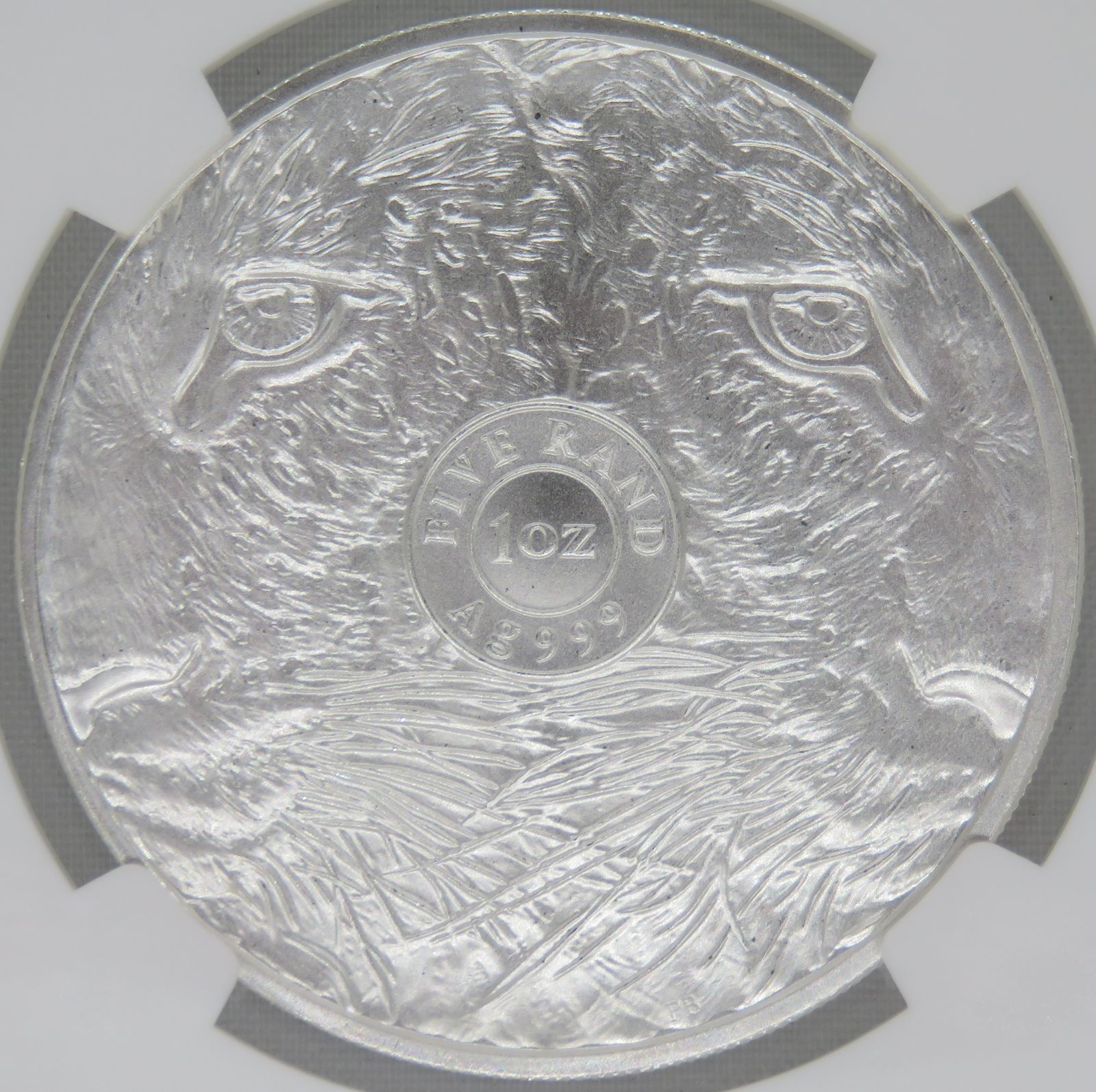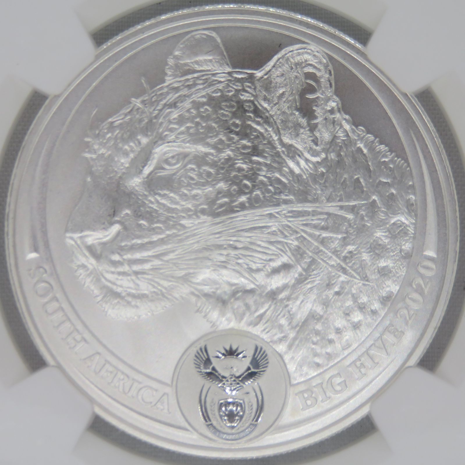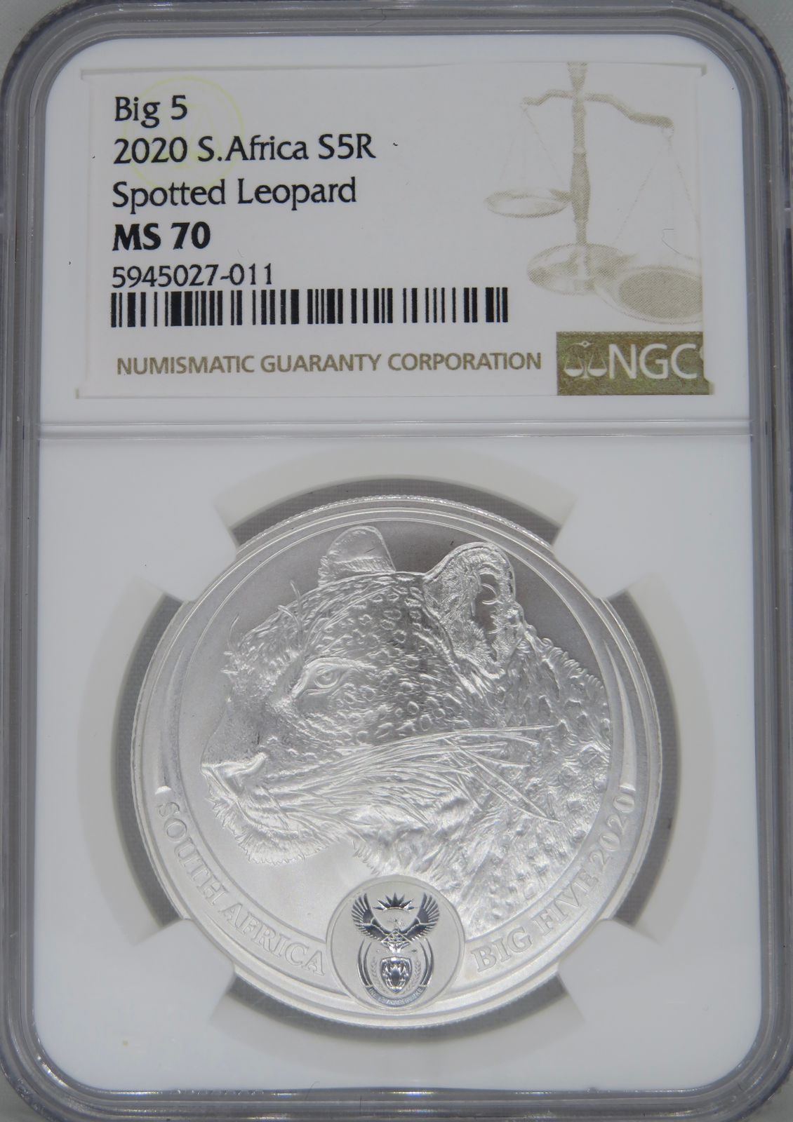 South Africa: Republic Silver R5 “Big 5 – Spotted Leopard” of 2020 MS 70 NGC.