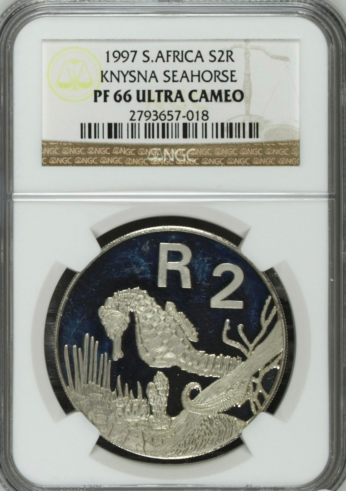 South Africa: Republic 1oz Silver R2 “Knysna Seahorse” of 1997 Proof 66 Ultra Cameo NGC.