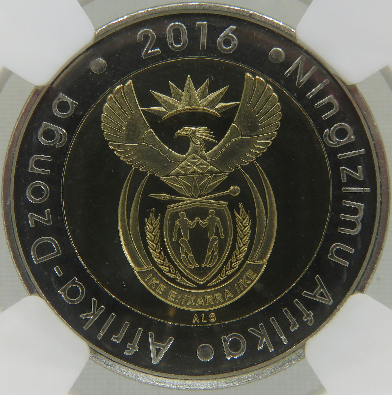 Lot 36: South Africa: Republic nickel plated copper R5 of 2016 Proof 69 Cameo NGC.