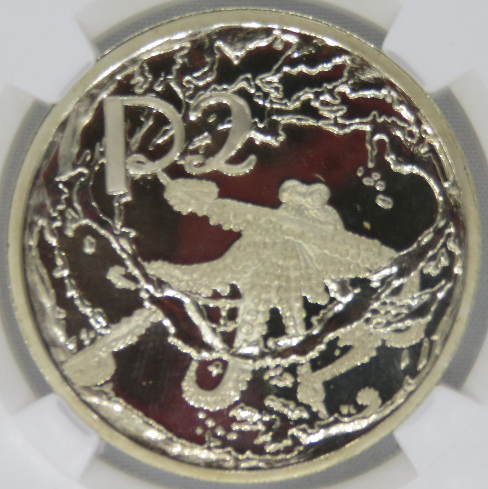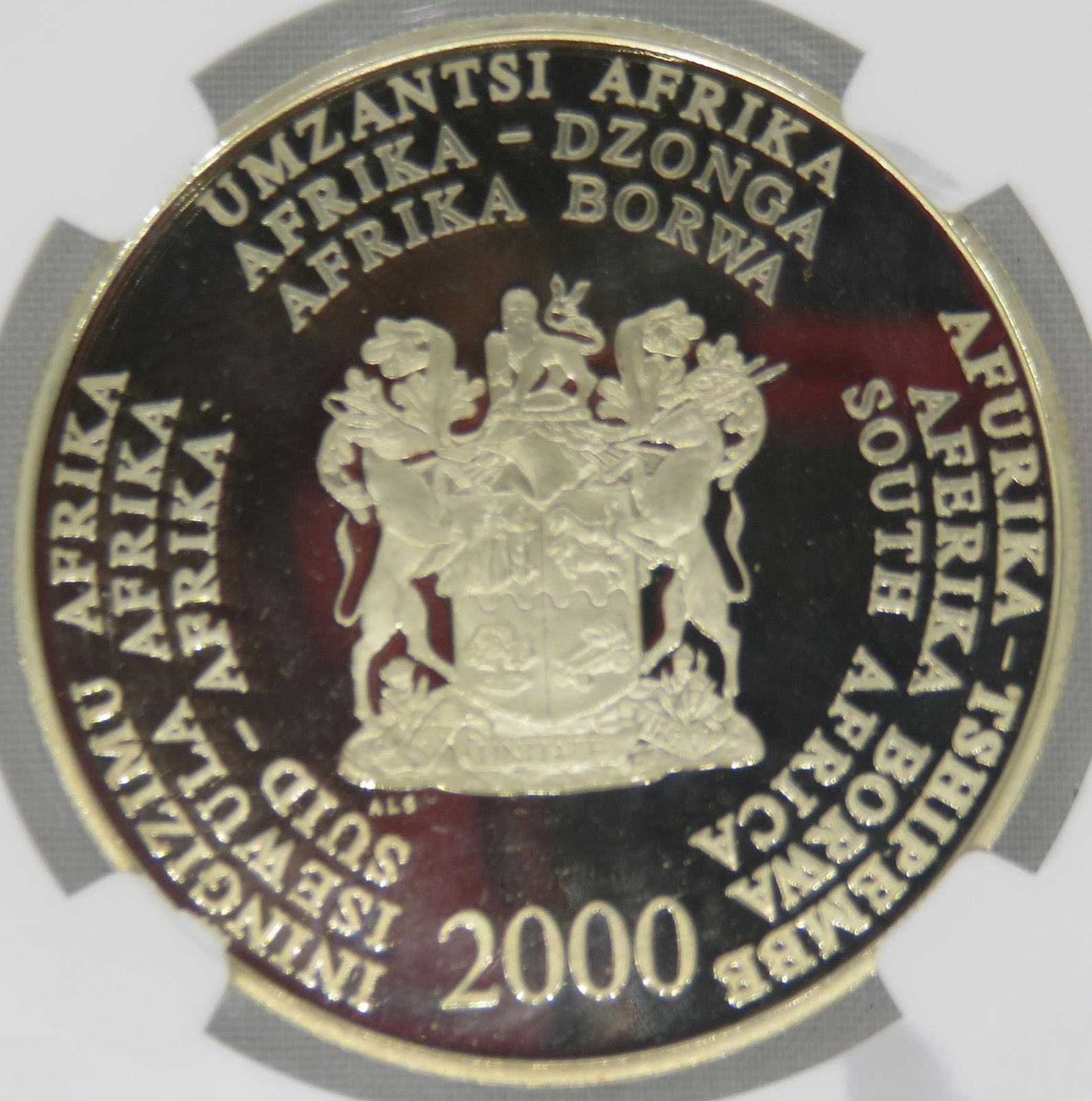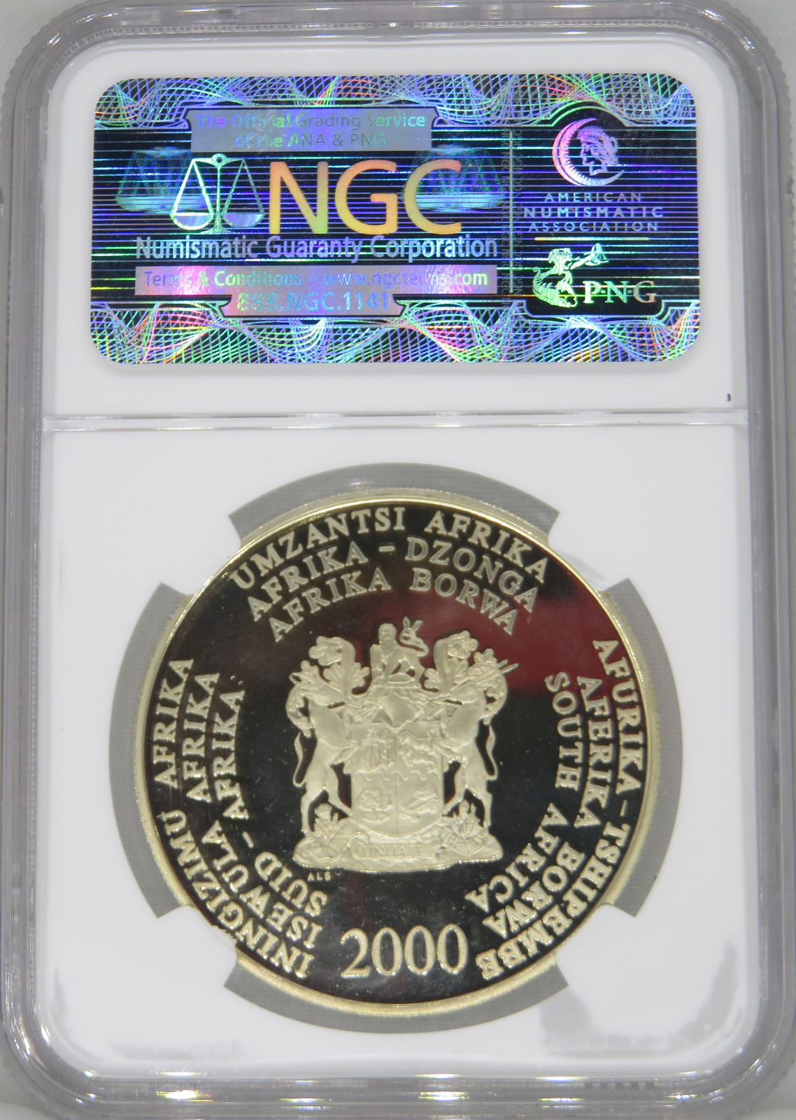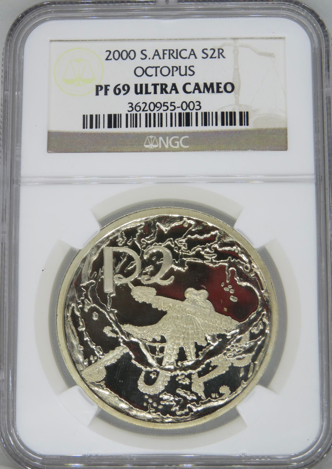 Lot 36: South Africa: Republic Silver R2 “Octopus” of 2000 Proof 69 Ultra Cameo NGC. Proof Mintage: 3344. Superb gem proof. Sold @ R900.