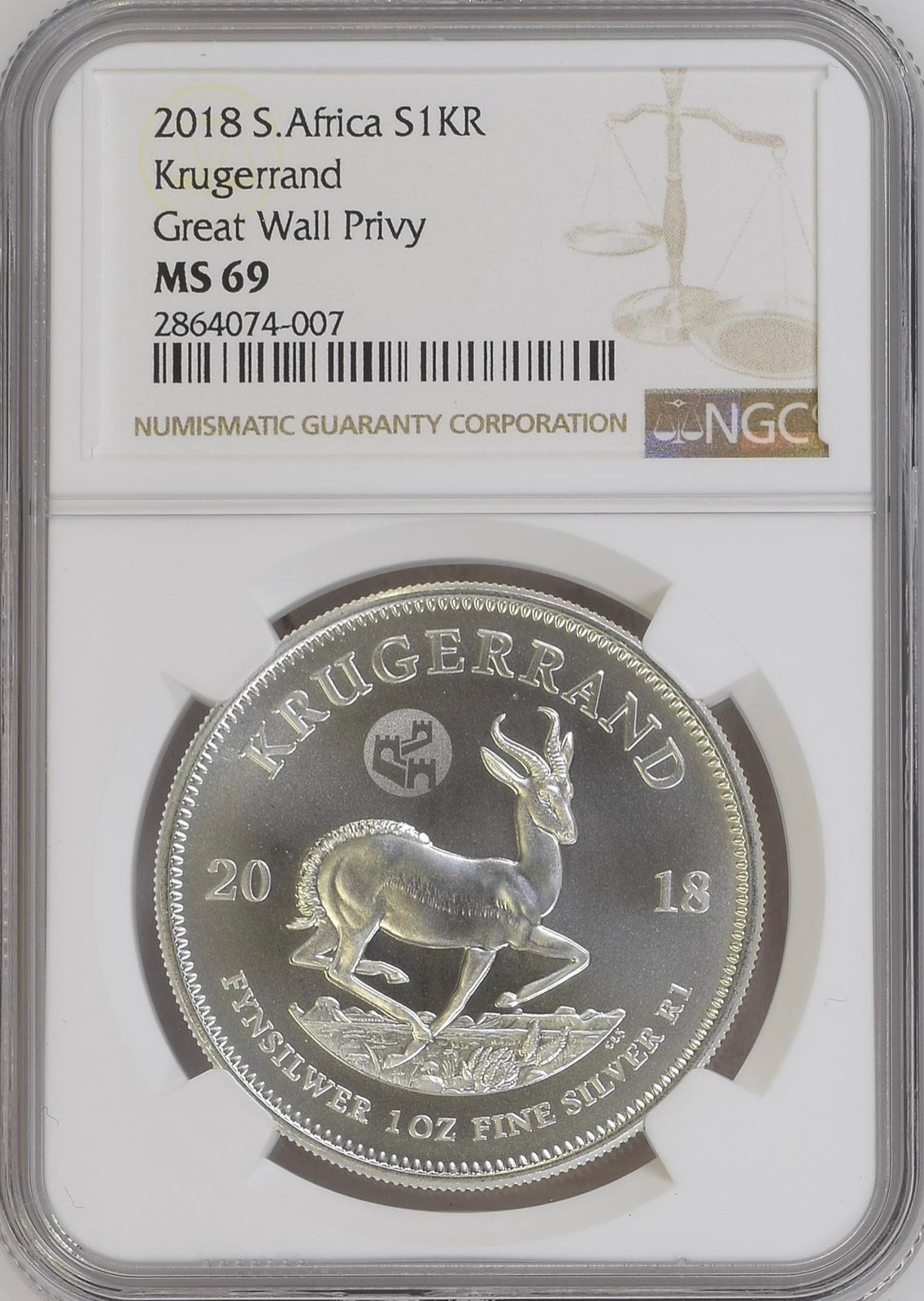 South Africa: Republic Silver 1oz Krugerrand “Great Wall Privy” of 2018 MS 69 NGC.