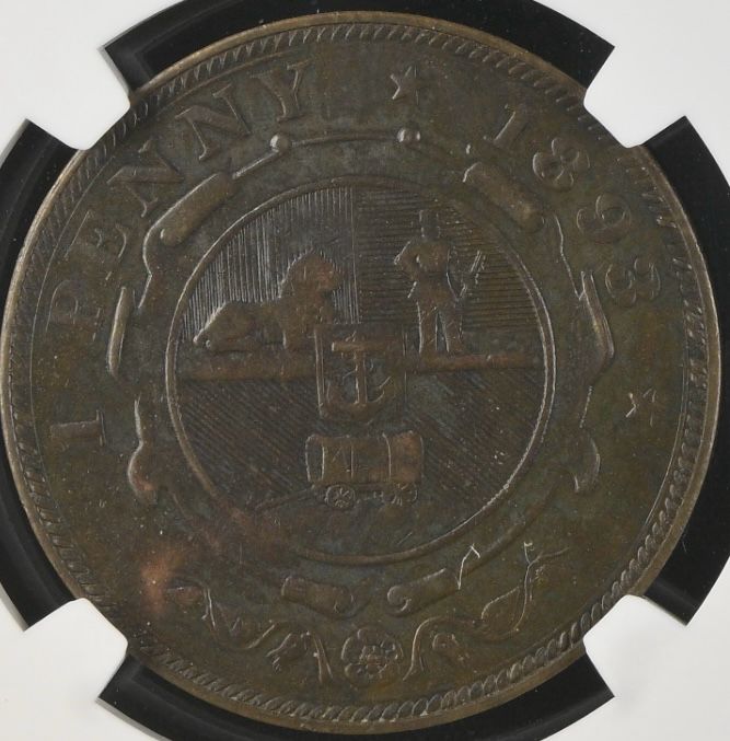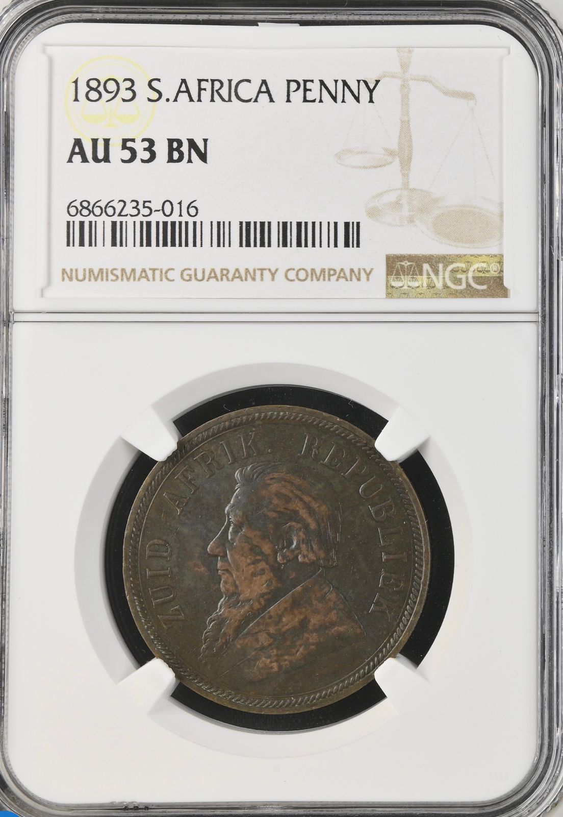 Lot 4: South Africa: Paul Kruger ZAR bronze penny of 1893 AU 53 NGC. Mintage: 54 781. Key Date. Hern’s Price UNC: R14,000 and EF: R6,000. Sold @ R2,300.