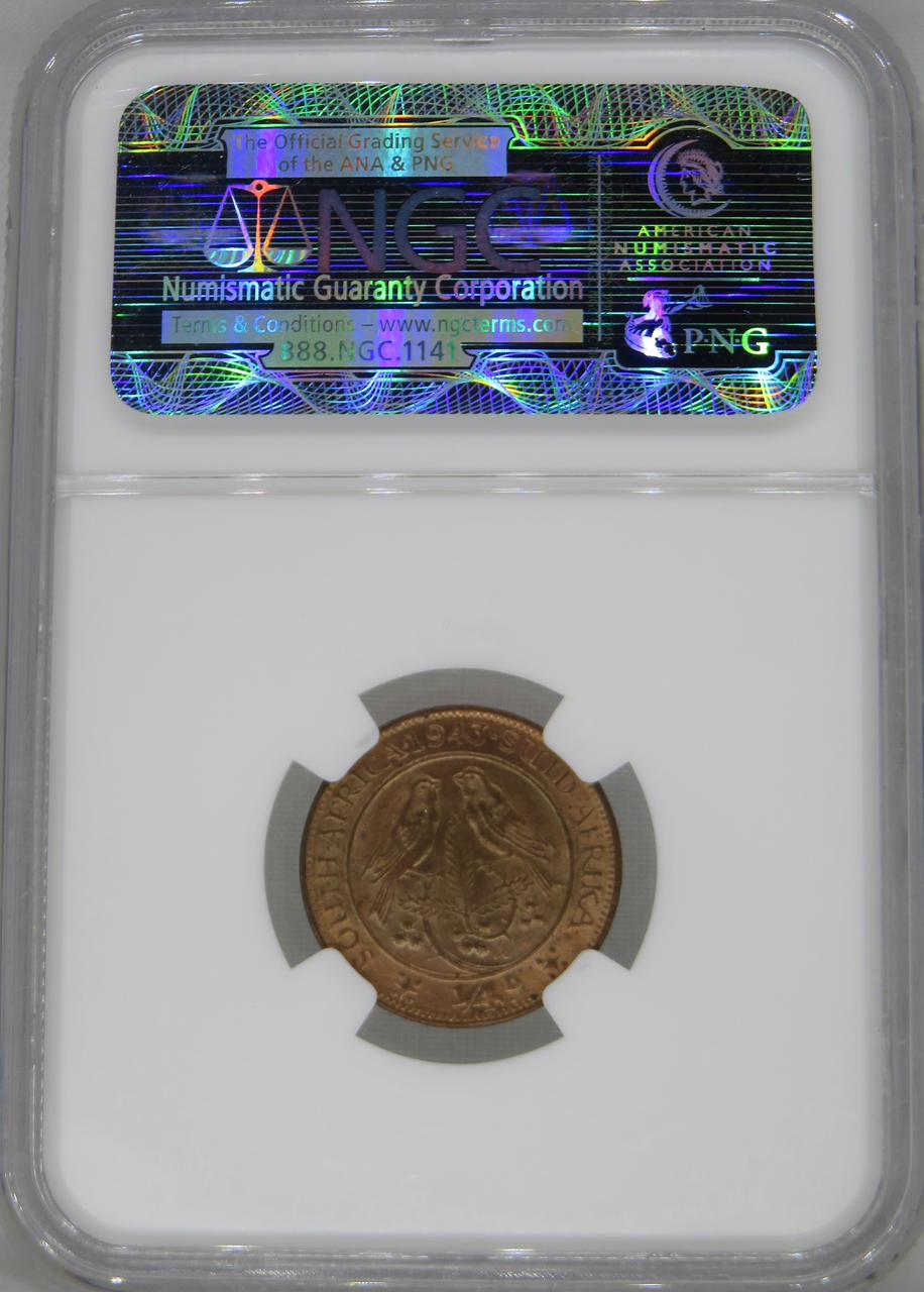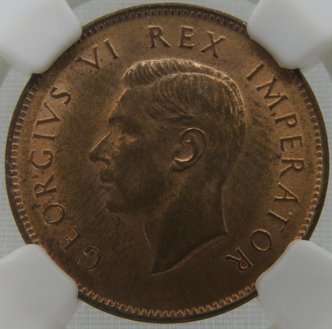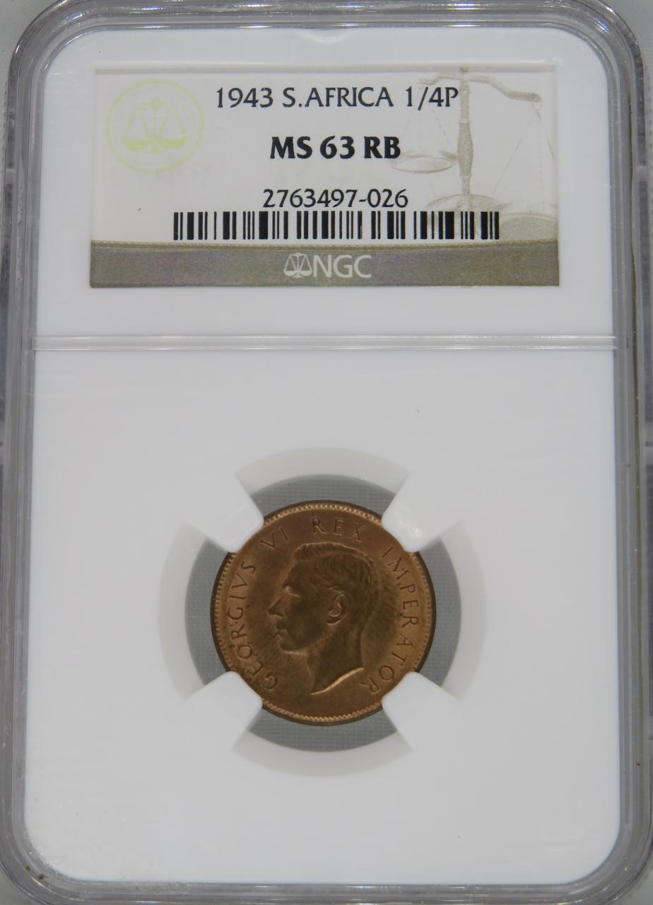 Lot 4: South Africa: Union George VI bronze quarter penny (farthing) of 1943 MS 63 Red & Brown NGC.