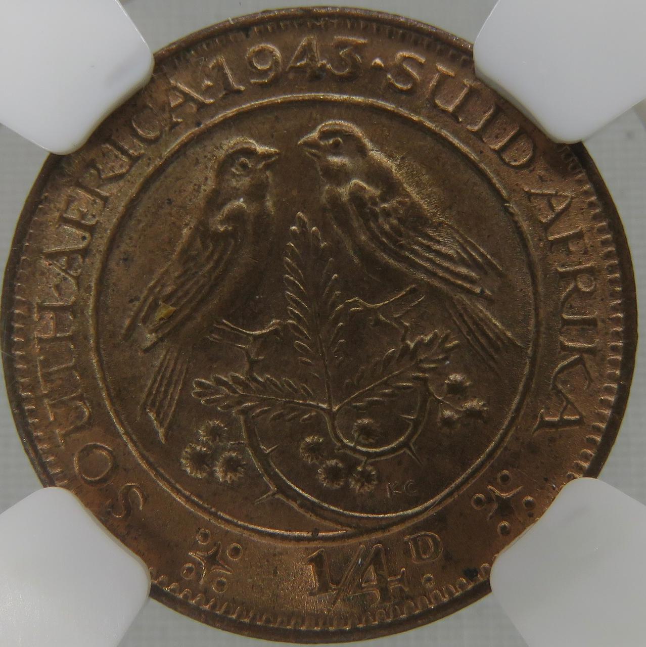South Africa: Union George VI bronze quarter penny (farthing) of 1943 MS 63 Red & Brown NGC.