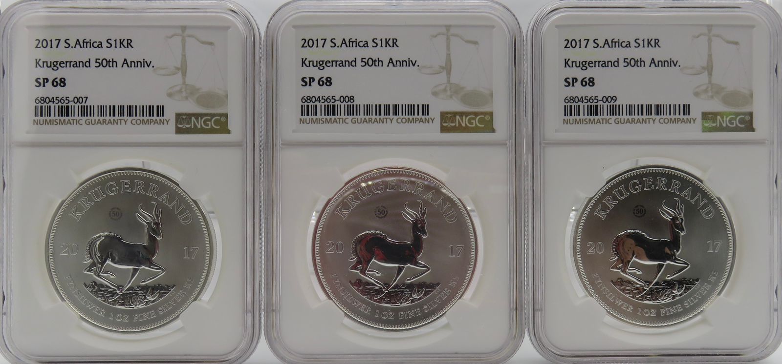South Africa: Lot of 3 x Republic Silver Krugerrand 1oz Fine Silver “50 Years Anniversary 1967-2017” Mintmark SP 68 NGC.