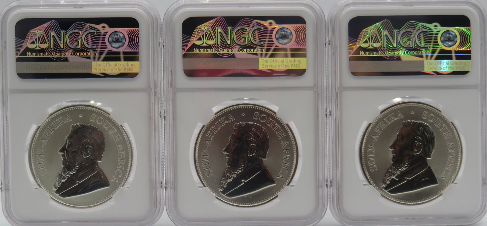 Lot 40: South Africa: Lot of 3 x Republic Silver Krugerrand 1oz Fine Silver “50 Years Anniversary 1967-2017” Mintmark SP 68 NGC.