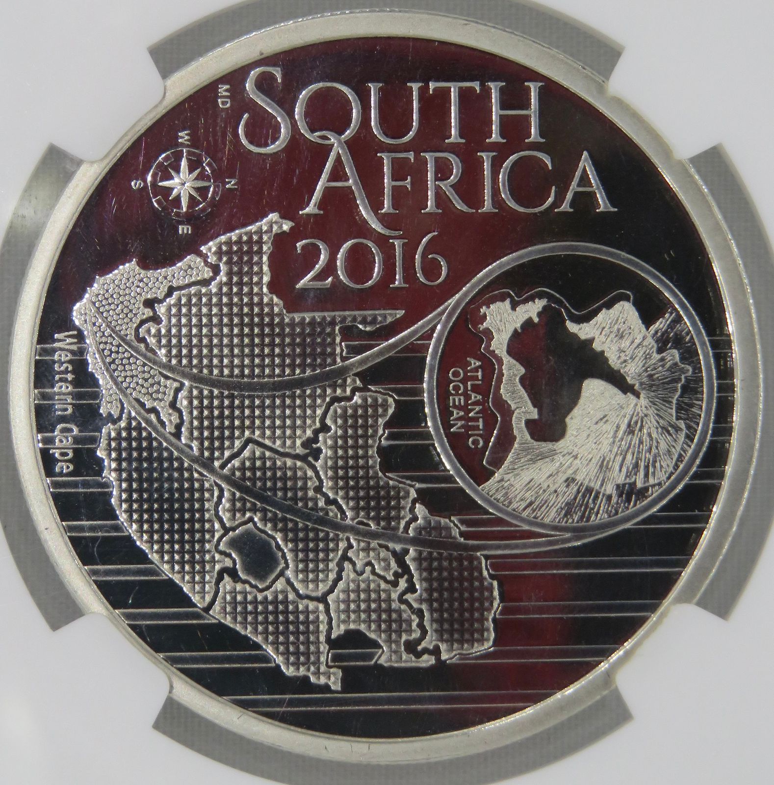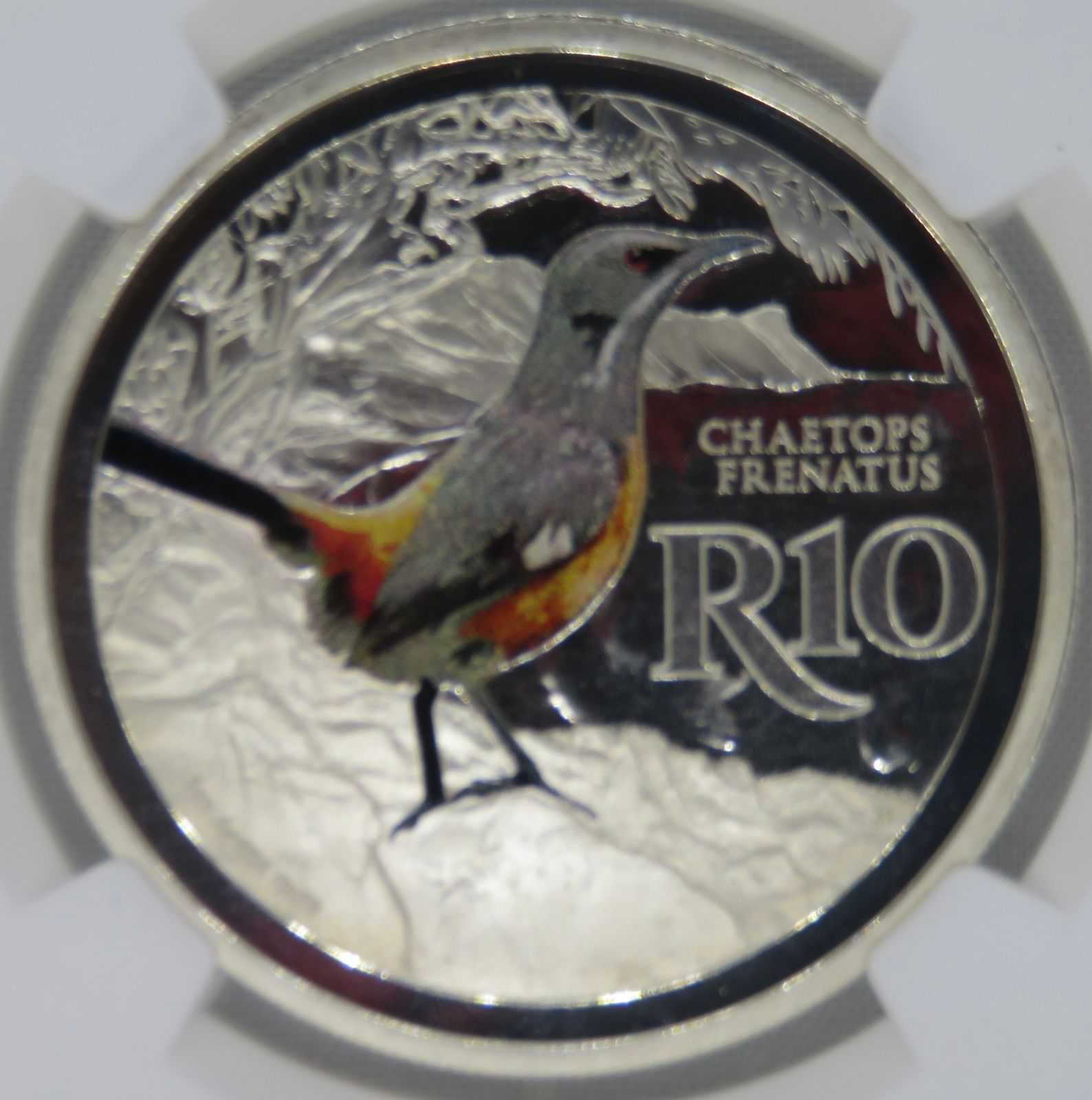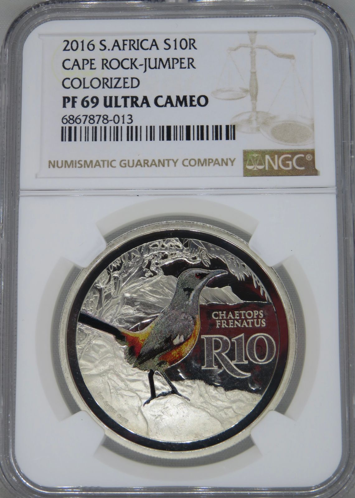 South Africa: Republic “Cape Rock-Jumper” Silver Colourized R10 of 2016 Proof 69 Ultra Cameo NGC.