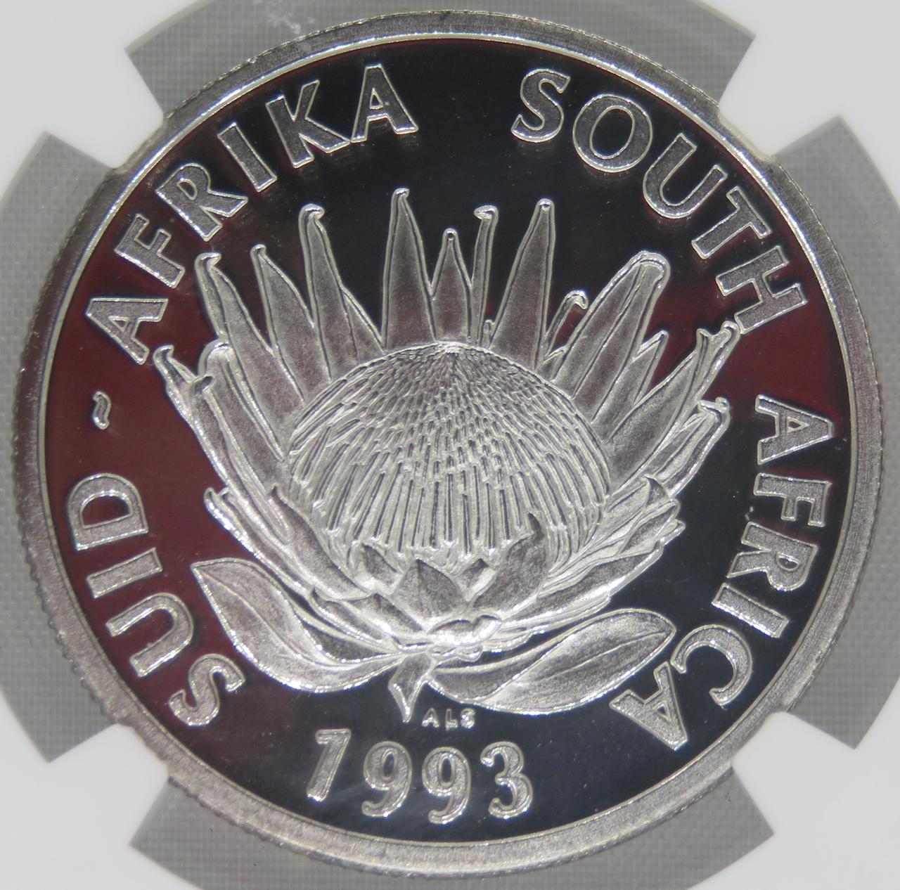 Lot 40: South Africa: Republic Protea Silver R1 “Banking Bicentennial” of 1993 MS 69 NGC.