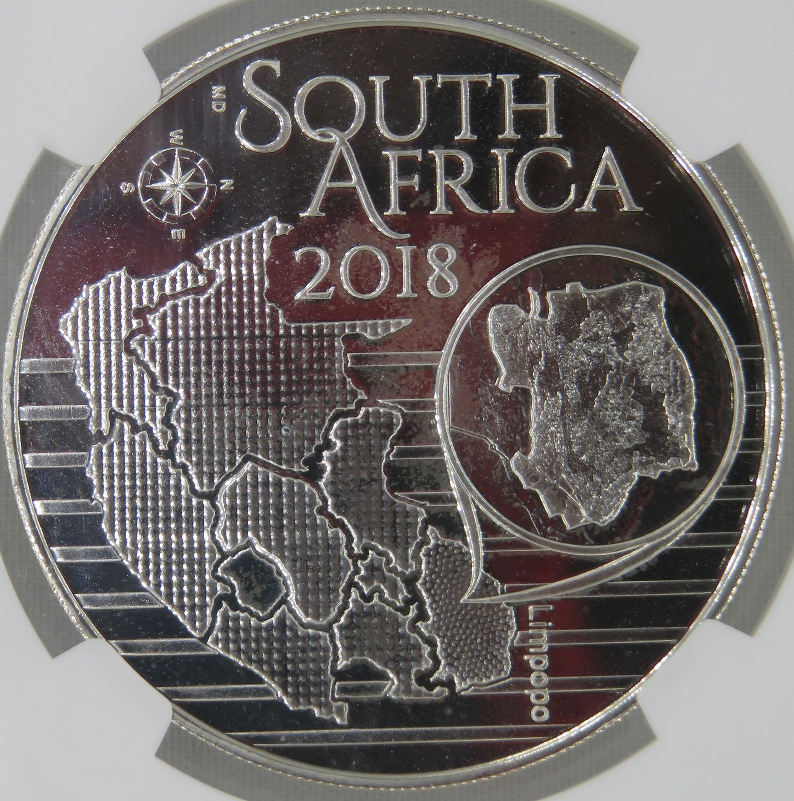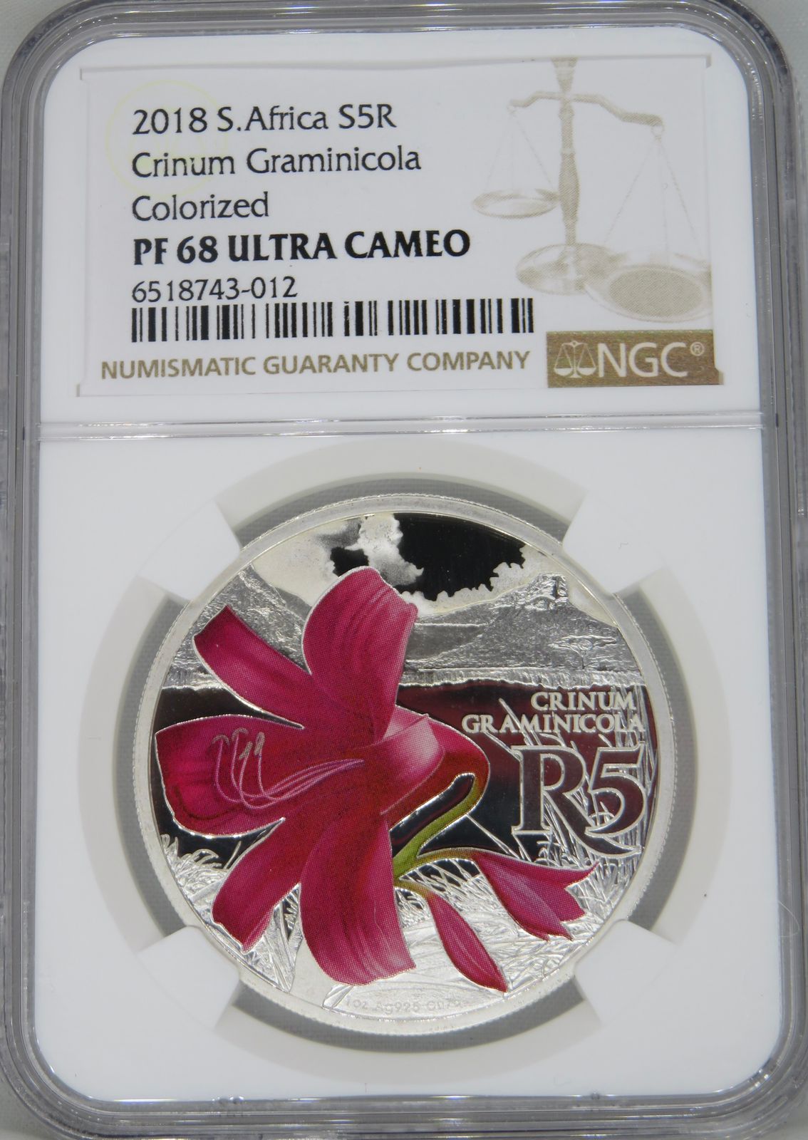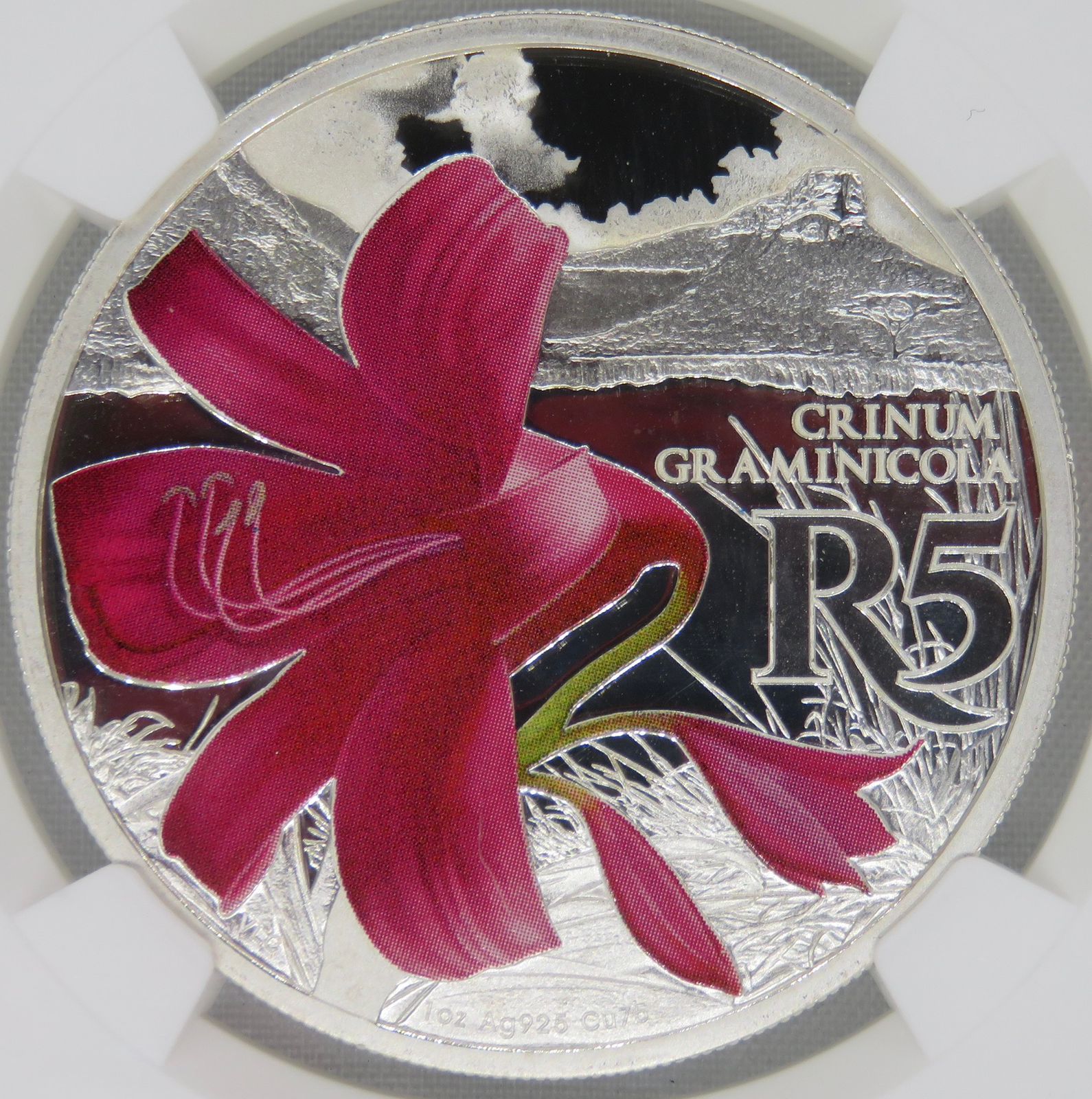 South Africa: Republic “Crinum Graminicola” (Grass Crinum) Colourized R5 (1oz Silver) of 2018 Proof 68 Ultra Cameo NGC.