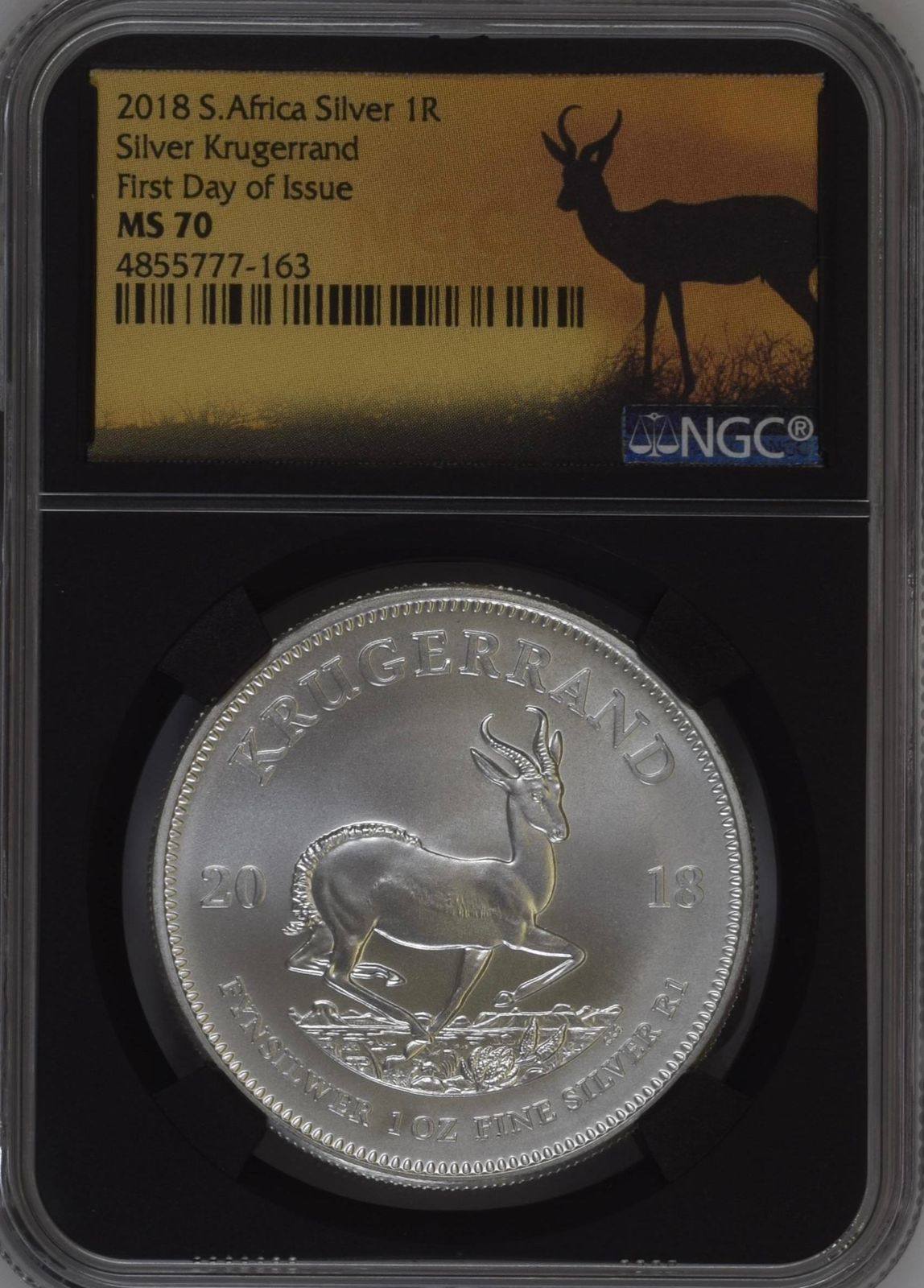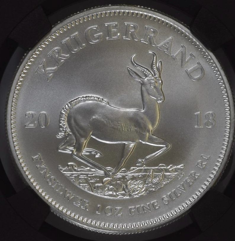 South Africa: Republic Silver Krugerrand 1oz of 2018 MS 70 NGC.