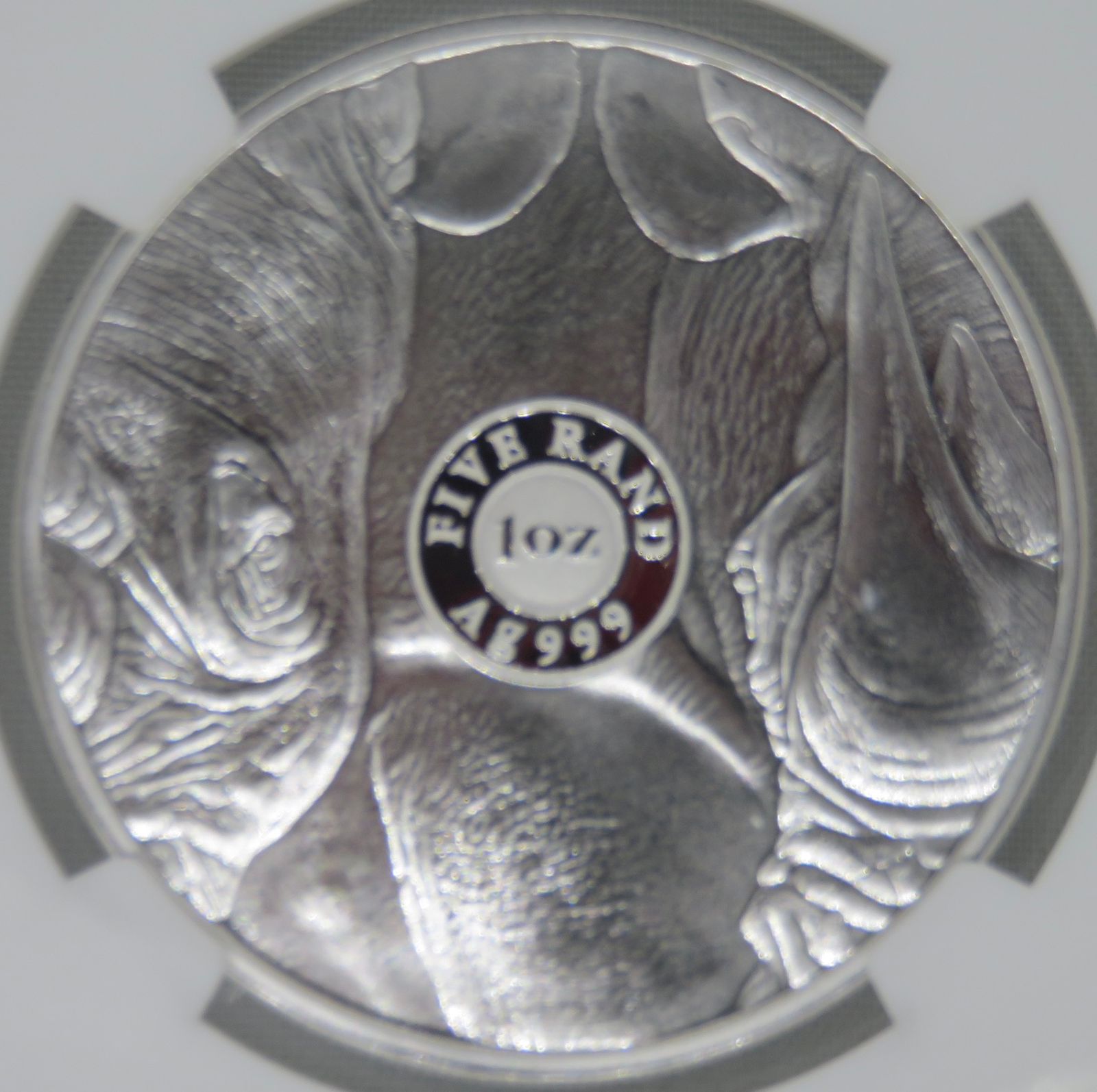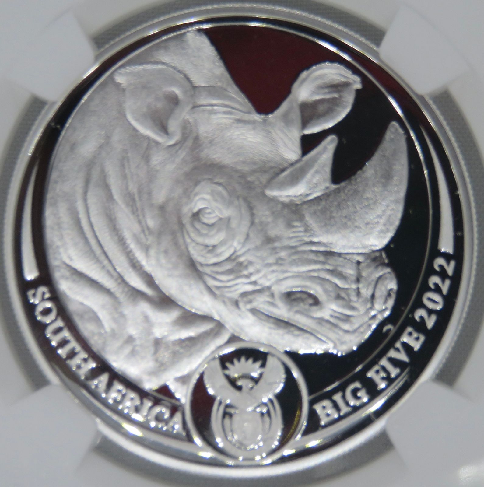 Lot 42: South Africa: Republic Silver R5 “Big 5 Series II – Rhino” of 2022 Proof 69 Ultra Cameo NGC. Superb Gem Proof. Sold @ R2,000.