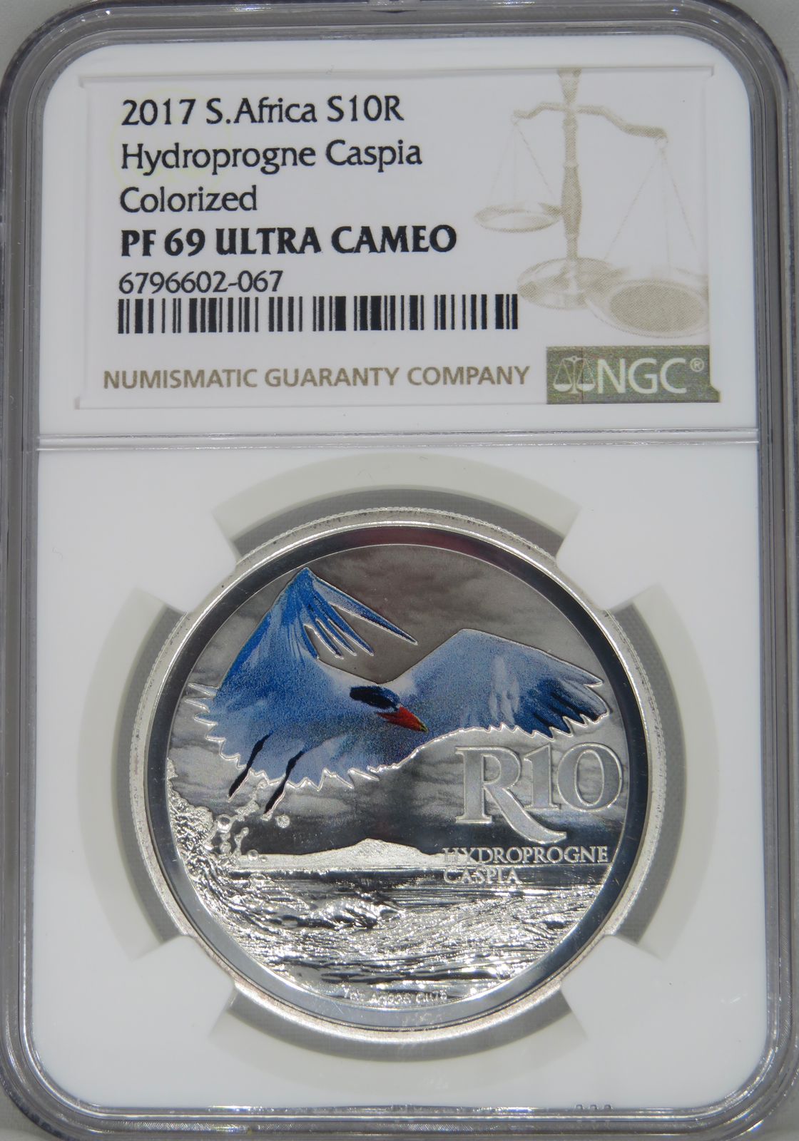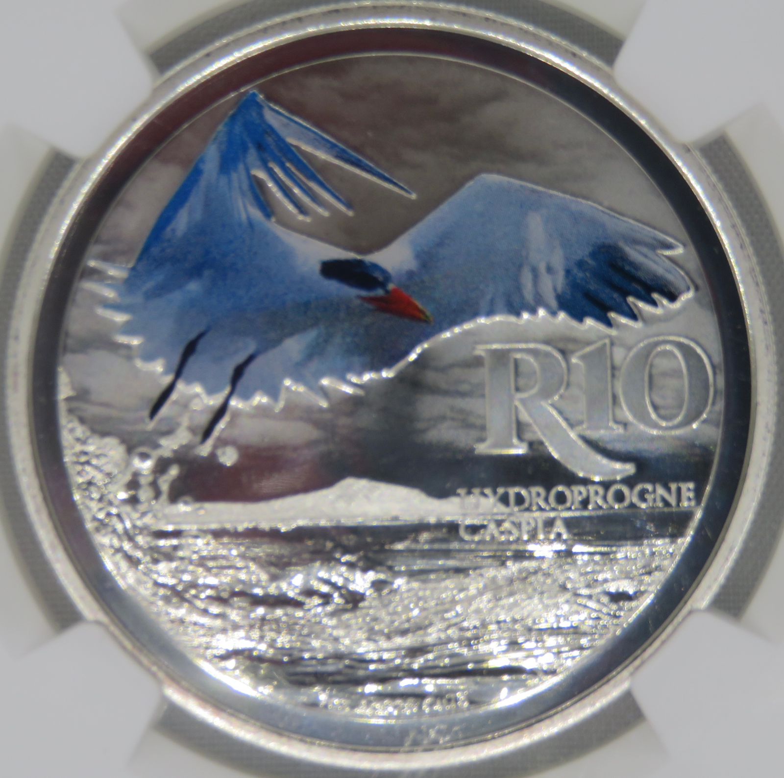 South Africa: Republic “Hydroprogne Caspia” (Caspian Tern) Colourized R10 (1oz Silver) of 2017 PF 69 NGC
