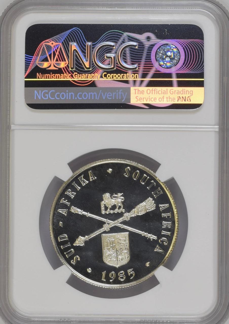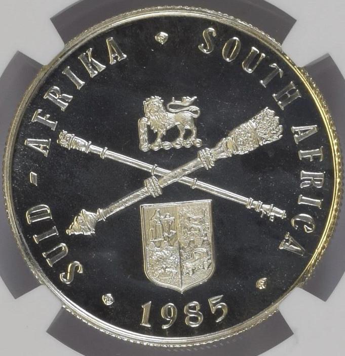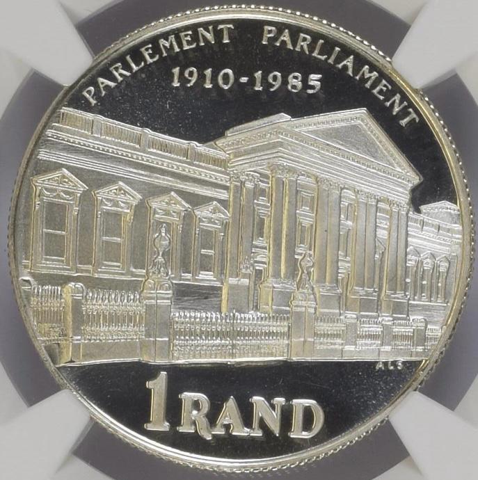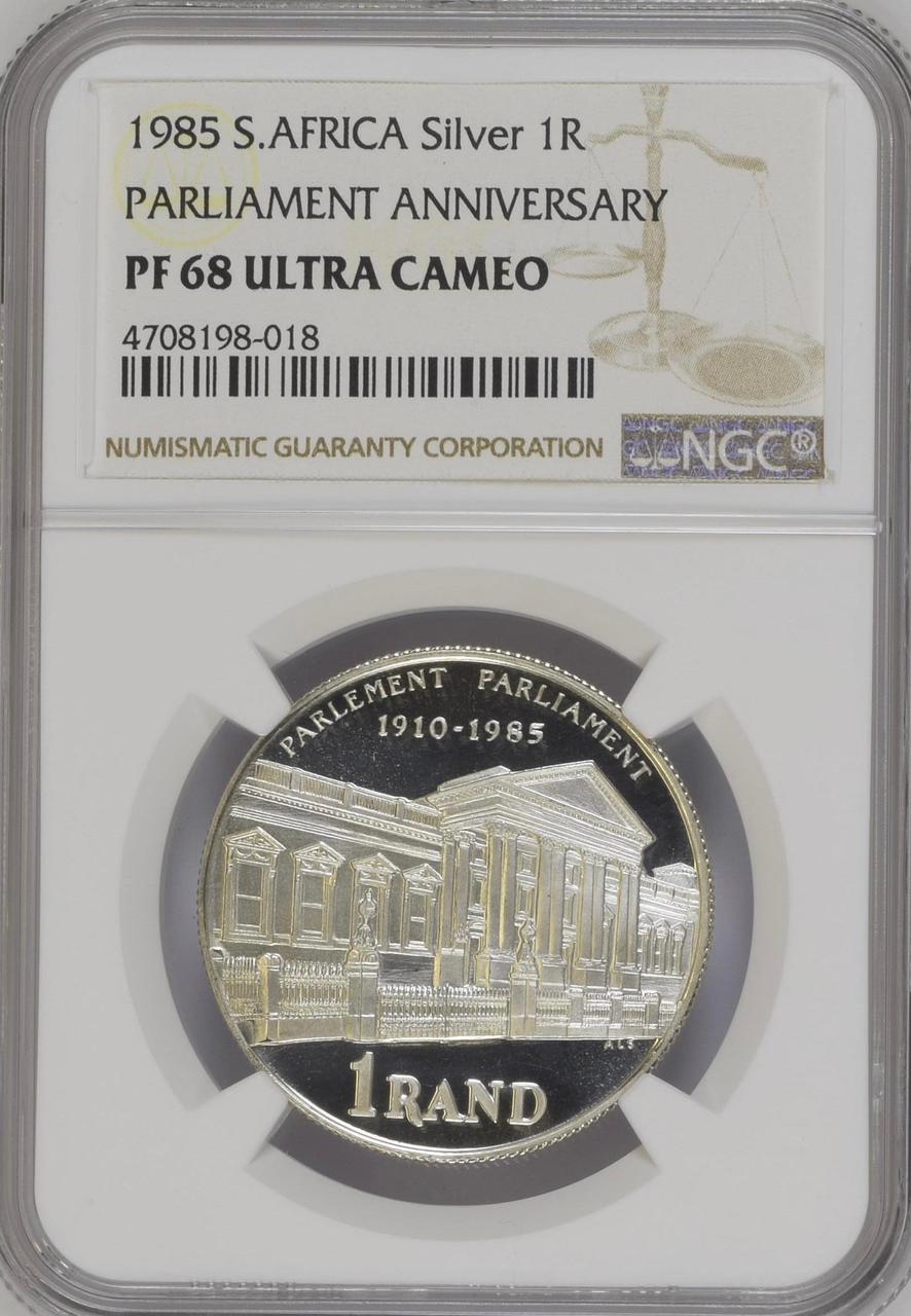 South Africa: Republic Silver R1 “Parliament Anniversary” of 1985 Proof 68 NGC.