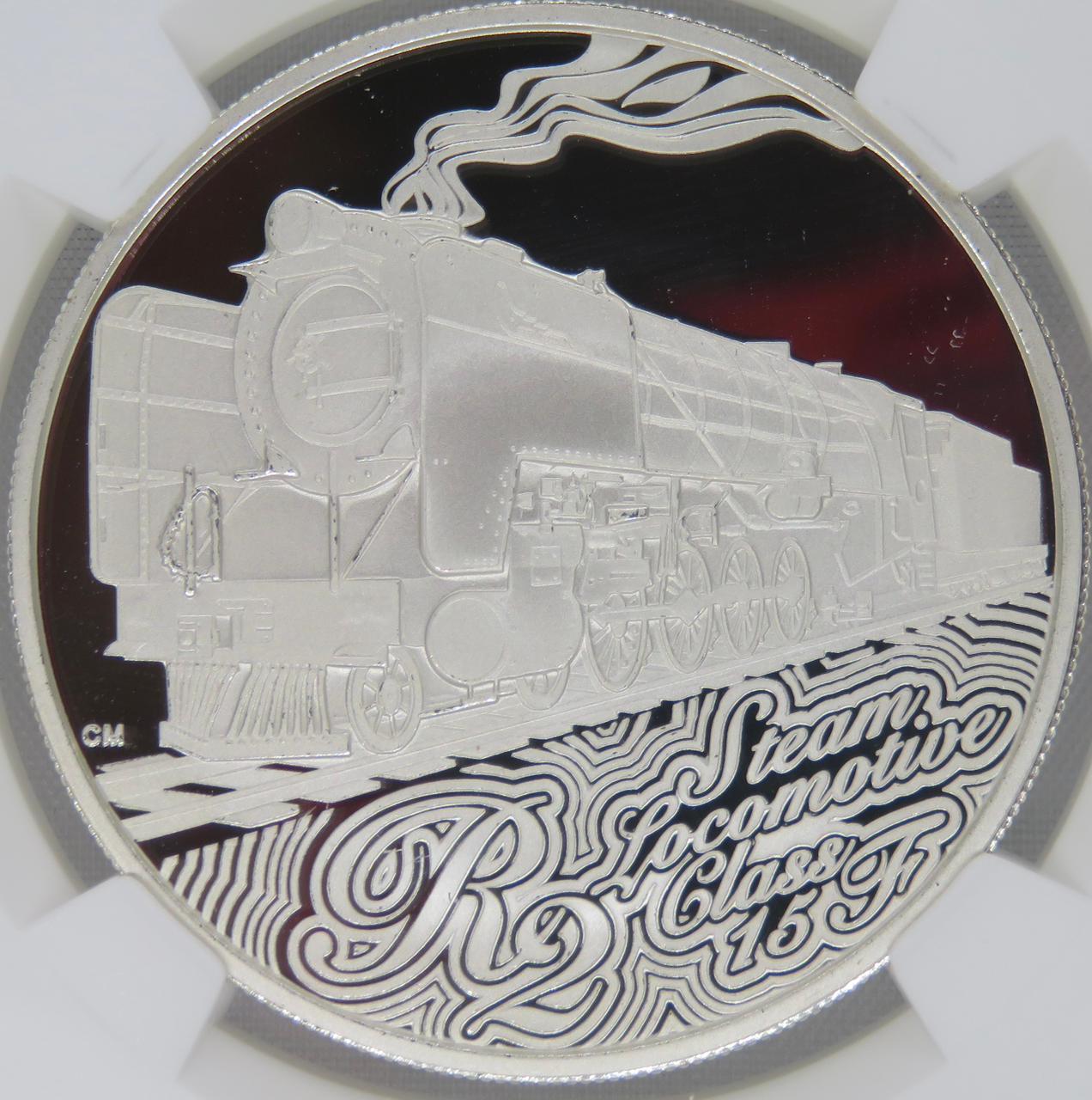 Lot 43: South Africa: Republic Silver R2 “Trains of South Africa – Steam Class 15F” of 2015 Proof 70 NGC.
