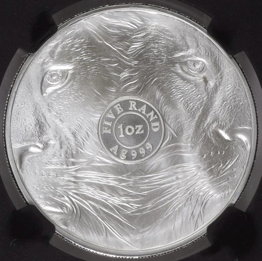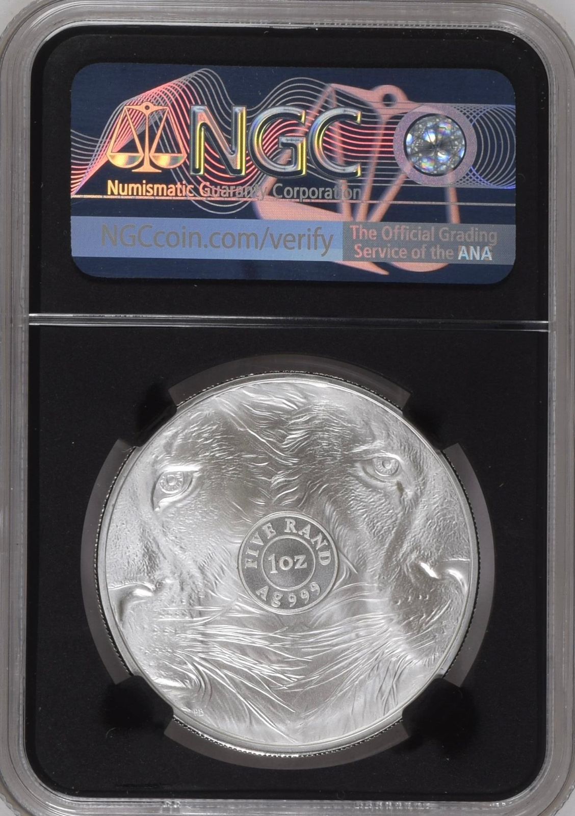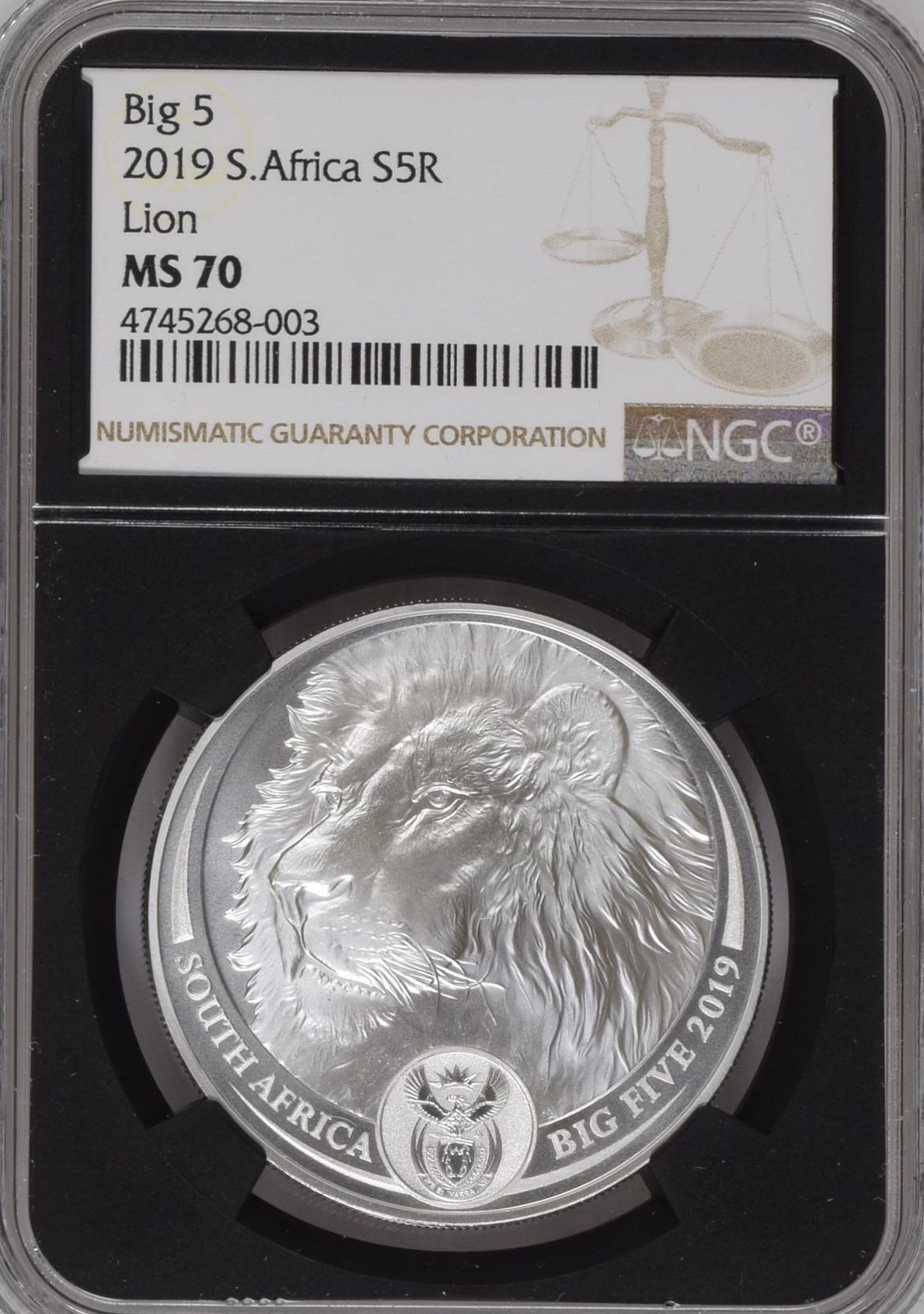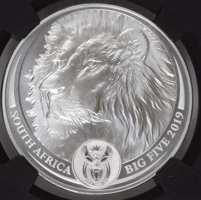 Lot 43: South Africa: Republic Silver R5 “Big 5 Series I – Lion” of 2019 MS 70 NGC. Perfect MS 70. Finest known @ NGC. Sold @ R1,800.