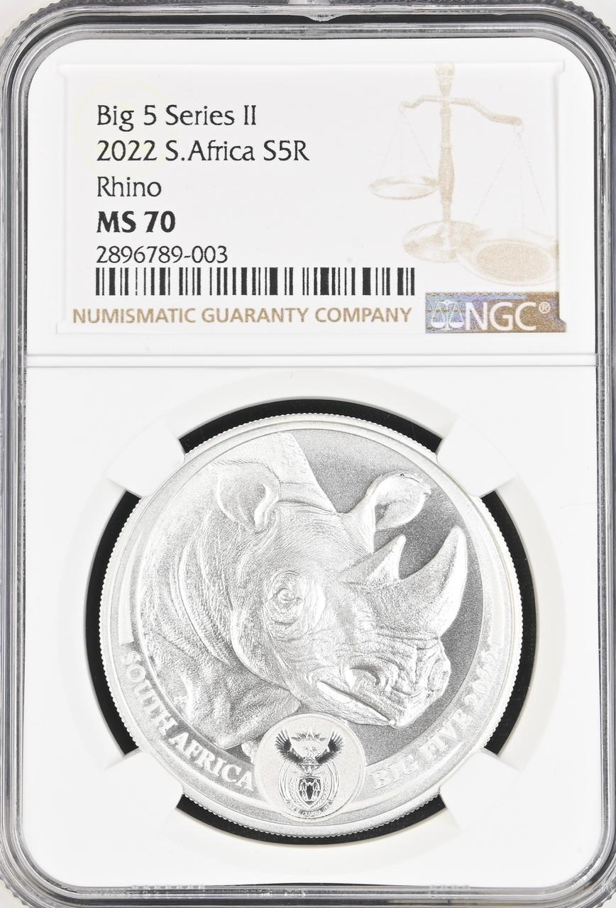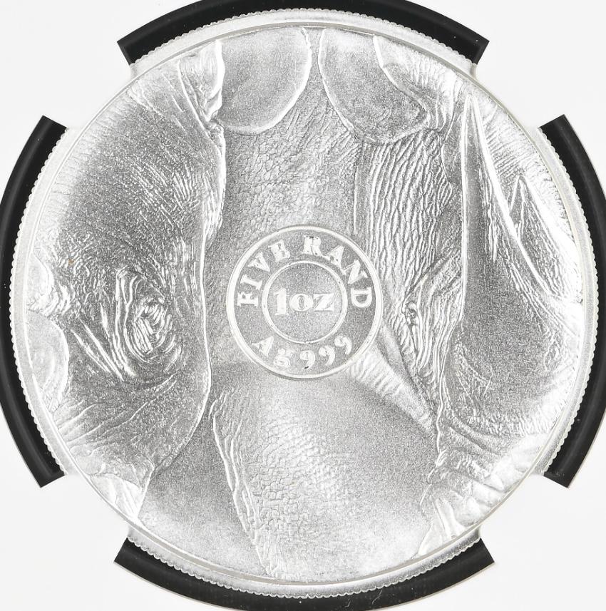 Lot 43: South Africa: Republic Silver R5 “Big 5 Series II – Rhino” of 2022 MS 70 NGC. Perfect MS 70. Finest known @ NGC. R.A. Moore Collection. Sold @ R1,750.