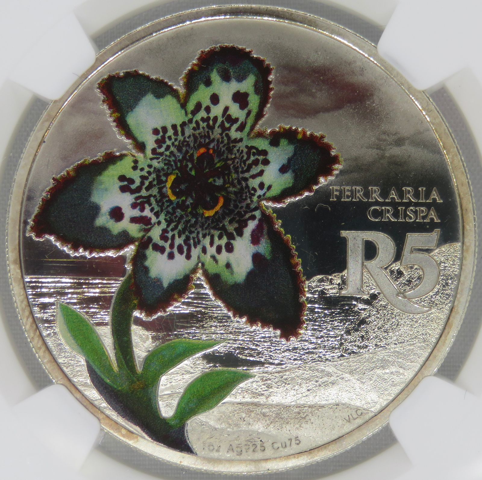 South Africa: Republic “Ferraria Crispa’”(Starfish Lily) Colourized R5 (1oz Silver) of 2017 Proof 67 NGC.