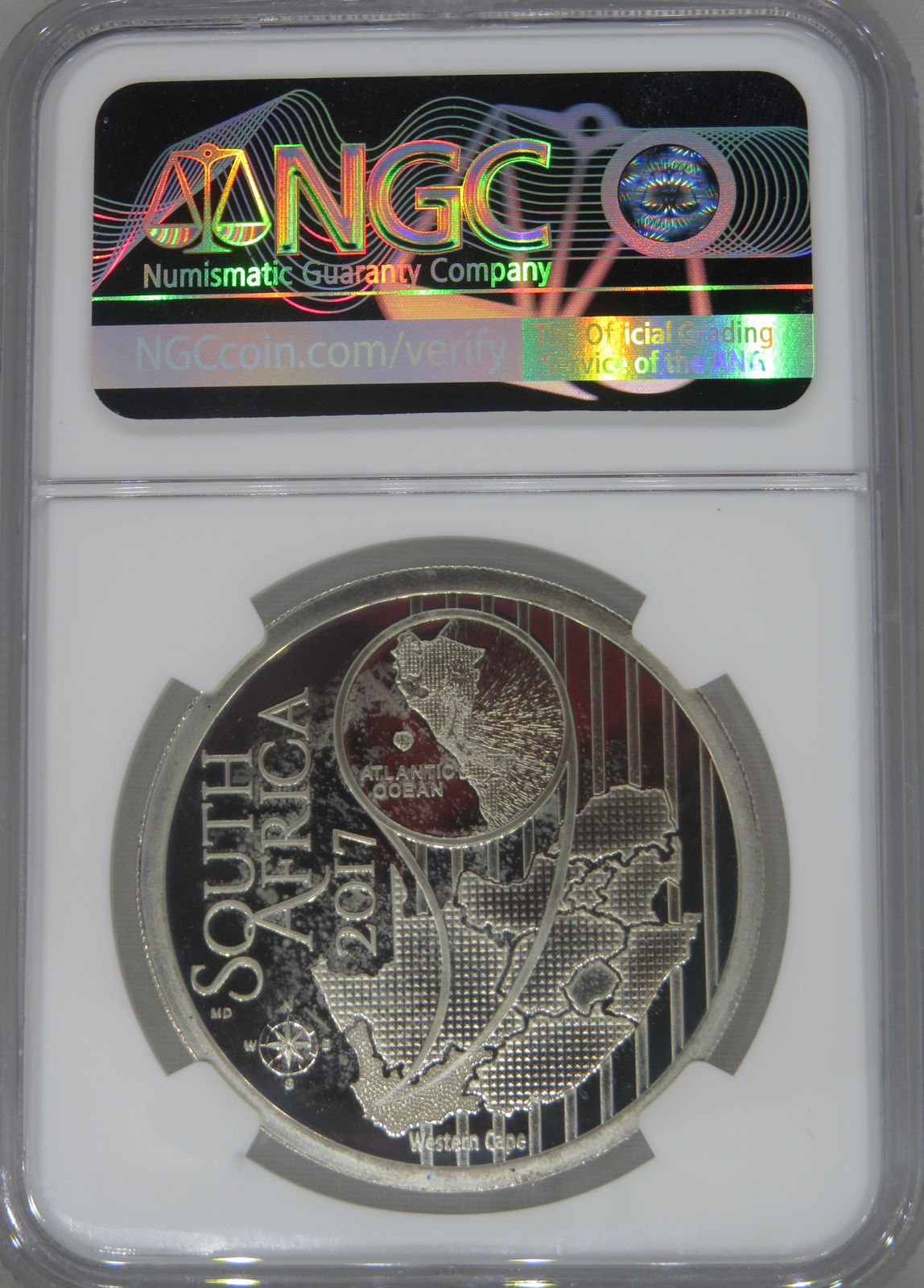 Lot 44: South Africa: Republic “Ferraria Crispa’”(Starfish Lily) Colourized R5 (1oz Silver) of 2017 Proof 67 NGC.
