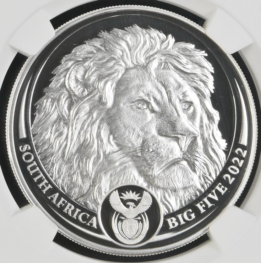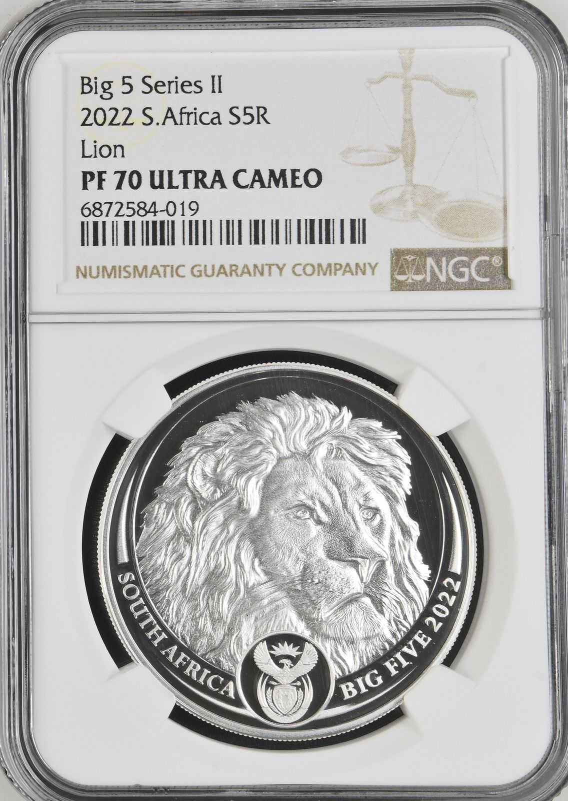 South Africa: Republic Silver R5 “Big 5 Series II – Lion” of 2022 Proof 70 Ultra Cameo NGC.