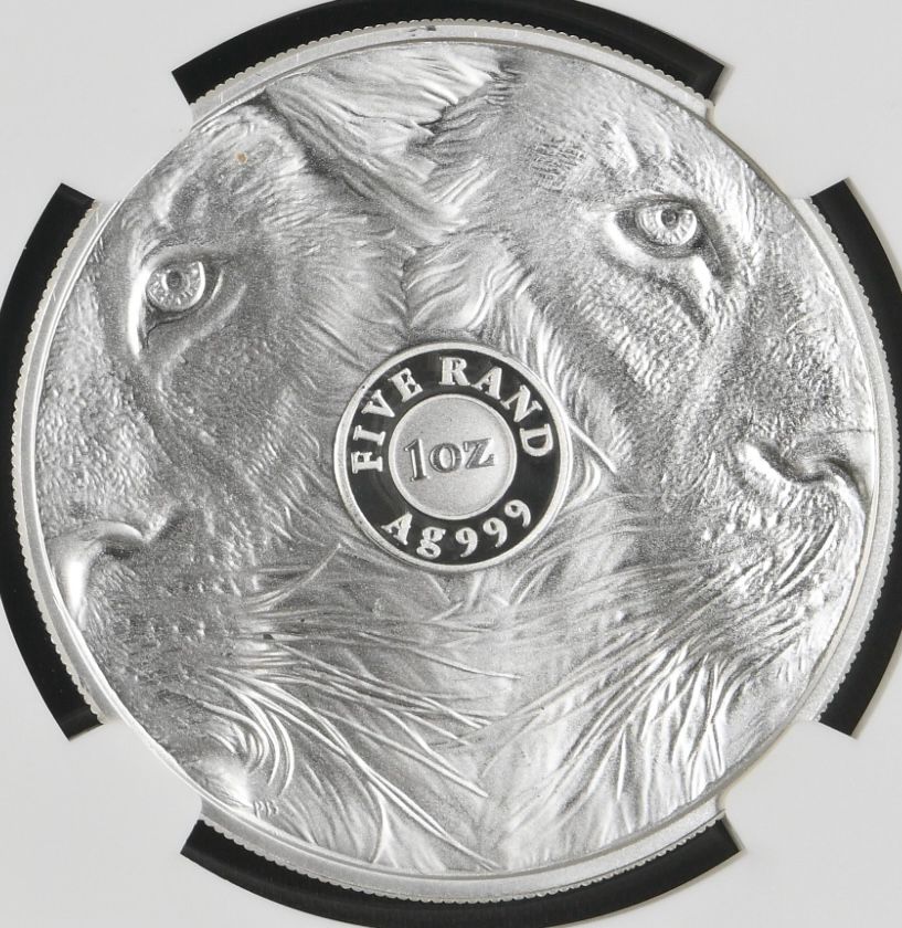 Lot 44: South Africa: Republic Silver R5 “Big 5 Series II – Lion” of 2022 Proof 70 Ultra Cameo NGC.