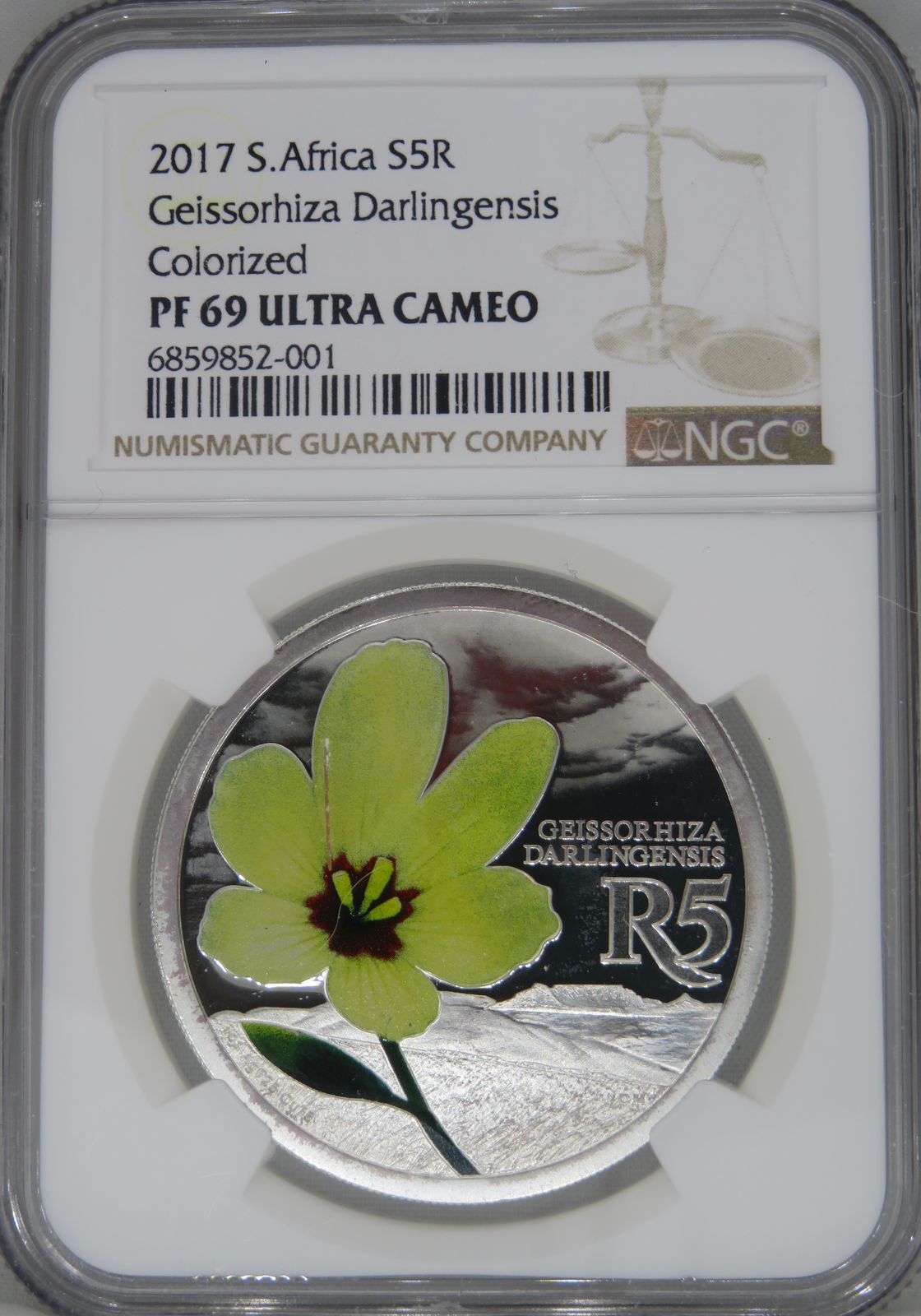 South Africa: Republic “Geissorhiza Darlingensis” (Yellow Wine Cup) Colourized R5 (1oz Silver) of 2017 Proof 69 NGC.