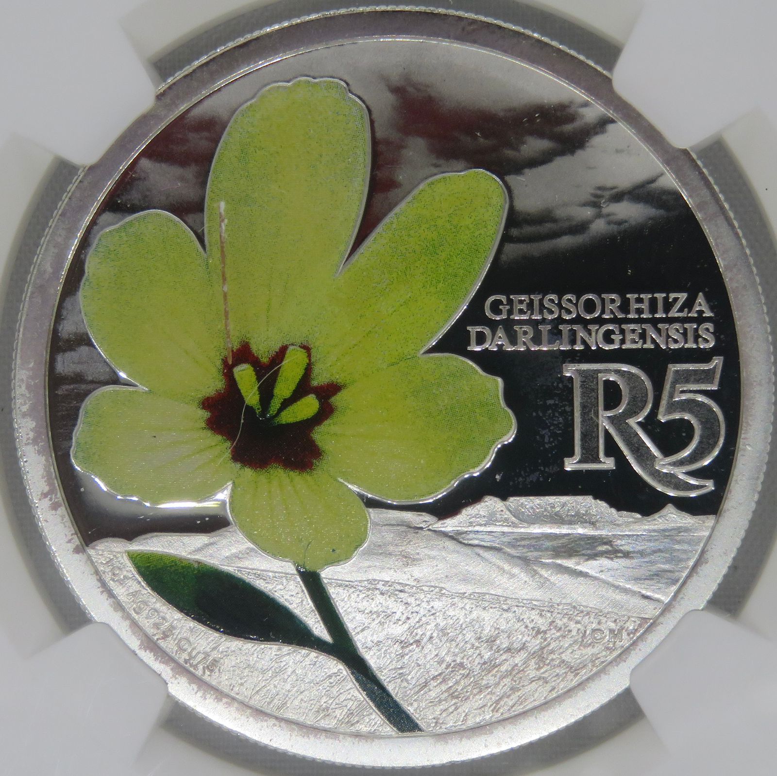 Lot 45: South Africa: Republic “Geissorhiza Darlingensis” (Yellow Wine Cup) Colourized R5 (1oz Silver) of 2017 Proof 69 NGC.