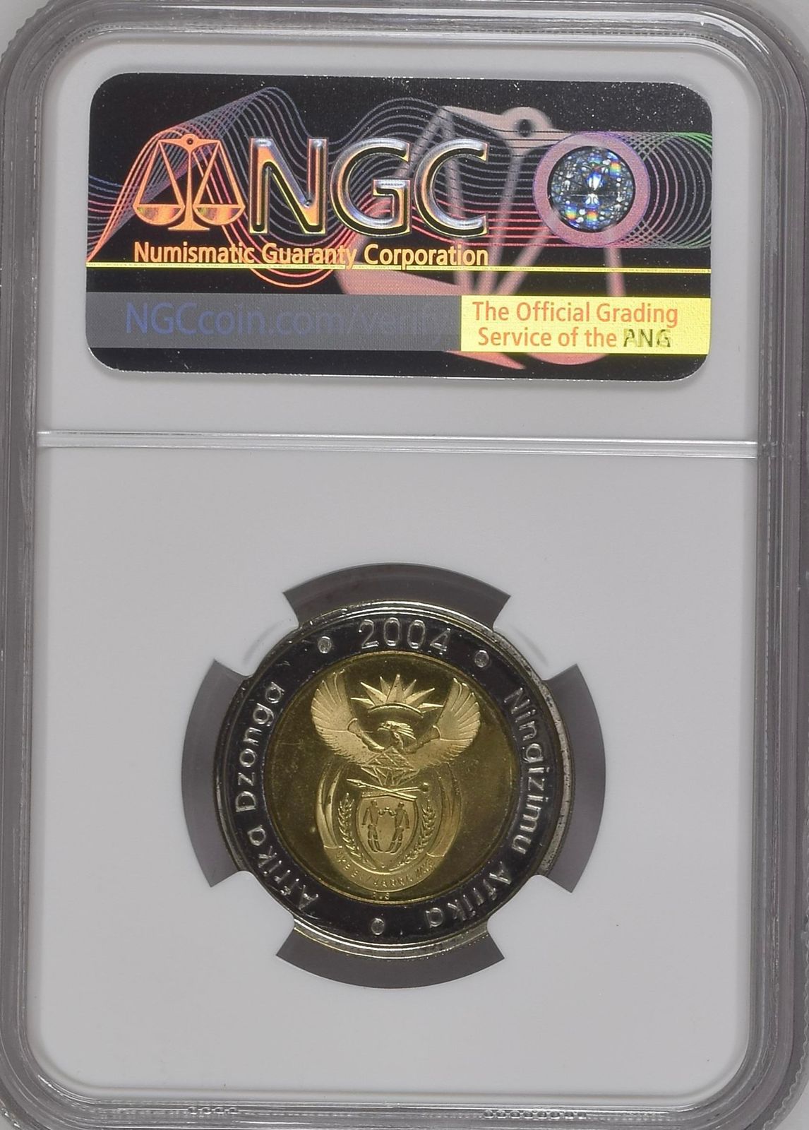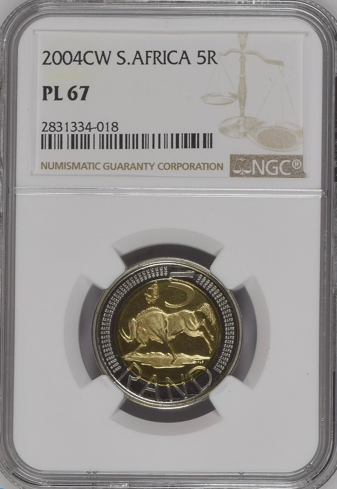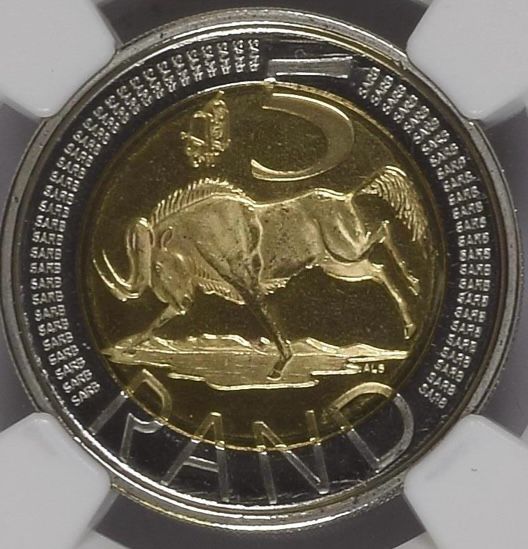 Lot 46: South Africa: Republic R5 “CW Mintmark” of 2004 PL 67 NGC. Mintage: 3243. Superb gem. 2nd highest grade @ NGC with 3 better. Sold @ R875.