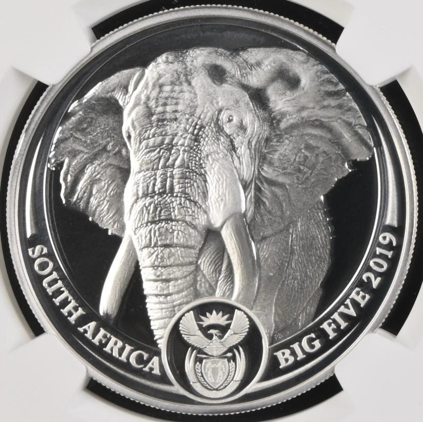 Lot 46: South Africa: Republic Silver R5 “Big 5 – Elephant” of 2019 Proof 69 NGC. Mintage: 964. Superb Gem Proof. 2nd Highest Grade @ NGC. Sold @ R2,900.