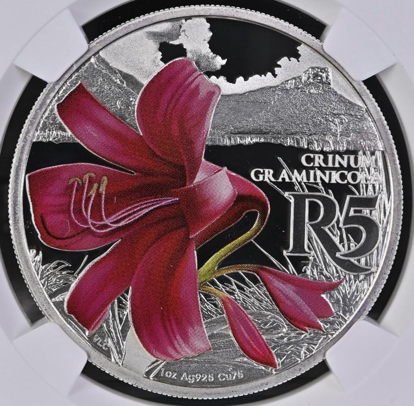 Lot 47: South Africa: Republic “Crinum Graminicola” (Grass Crinum) Colourized R5 (1oz Silver) of 2018 Proof 69 NGC.