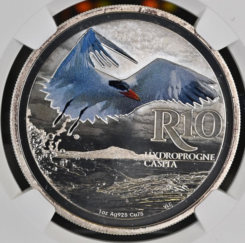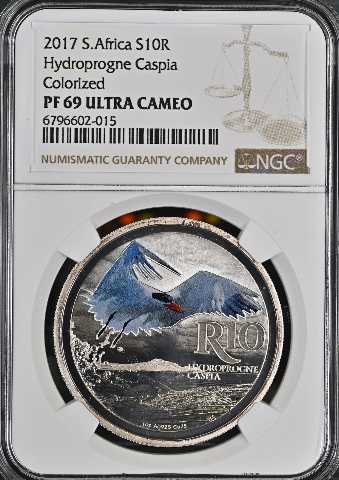South Africa: Republic “Hydroprogne Caspia” (Caspian Tern) Colourized R10 (1oz Silver) of 2017 Proof 69 Ultra Cameo NGC