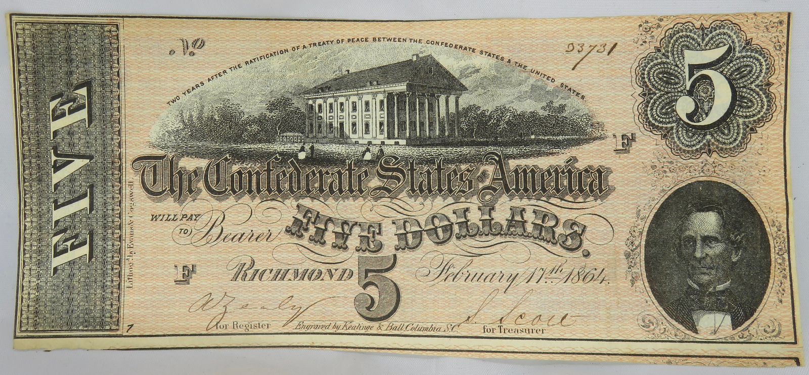 The Confederate States of America: Richmond Five Dollars note of 1864.
