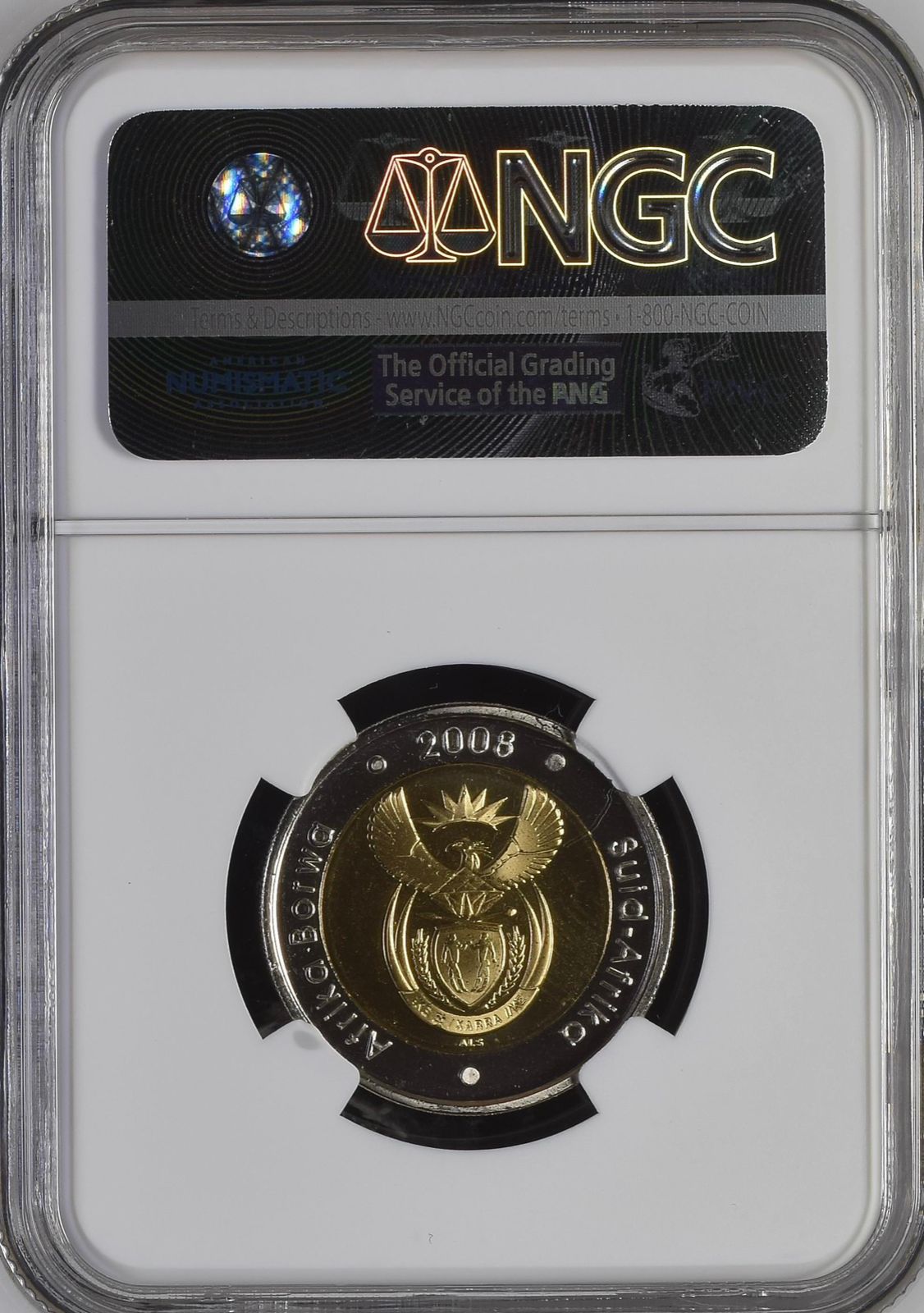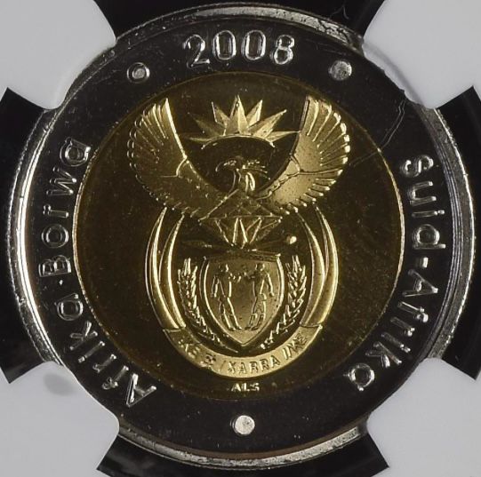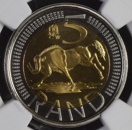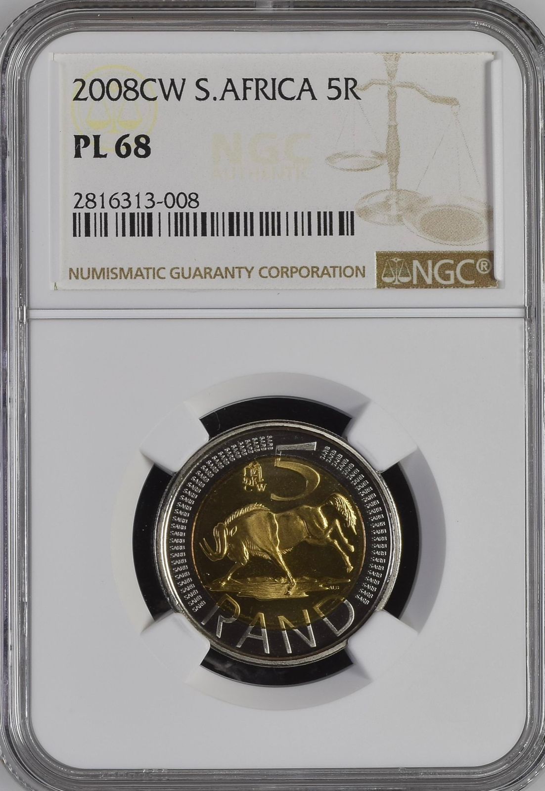Lot 48: South Africa: Republic R5 “CW Mintmark” of 2008 PL 68 NGC. Mintage: 2,990. Superb gem. 2nd highest grade @ NGC with only 2 better. Sold @ R800.