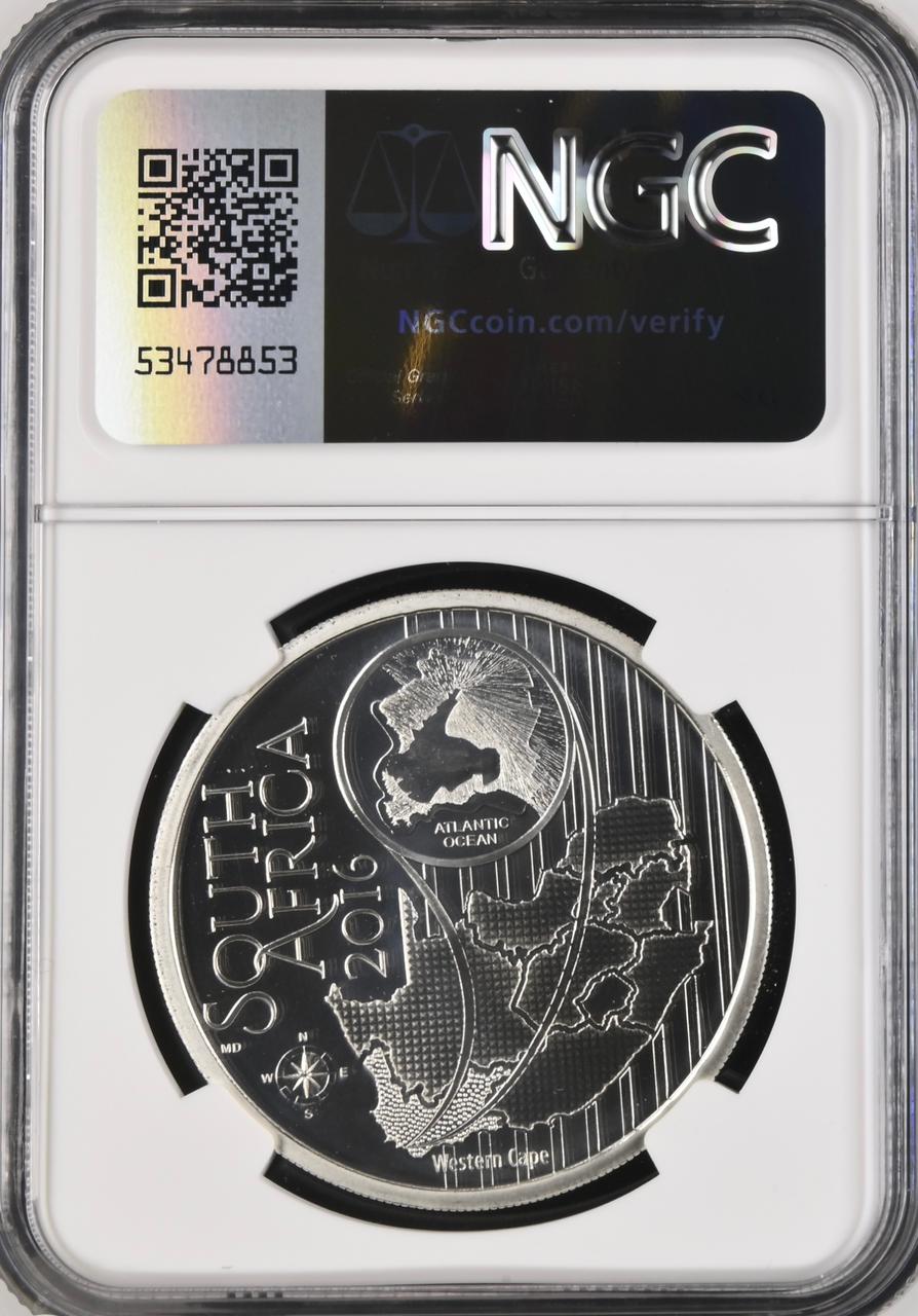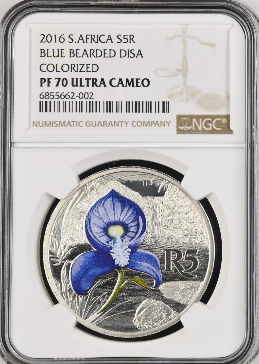 Lot 49: South Africa: Republic “Disa Venusta” (Blue Bearded Disa) Colourized R5 (1oz Silver) of 2016 Proof 70 NGC.