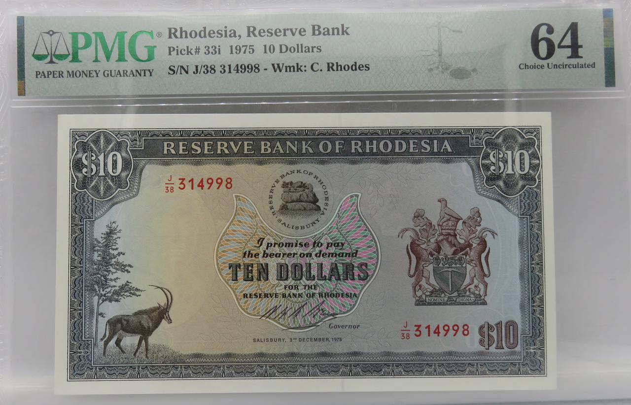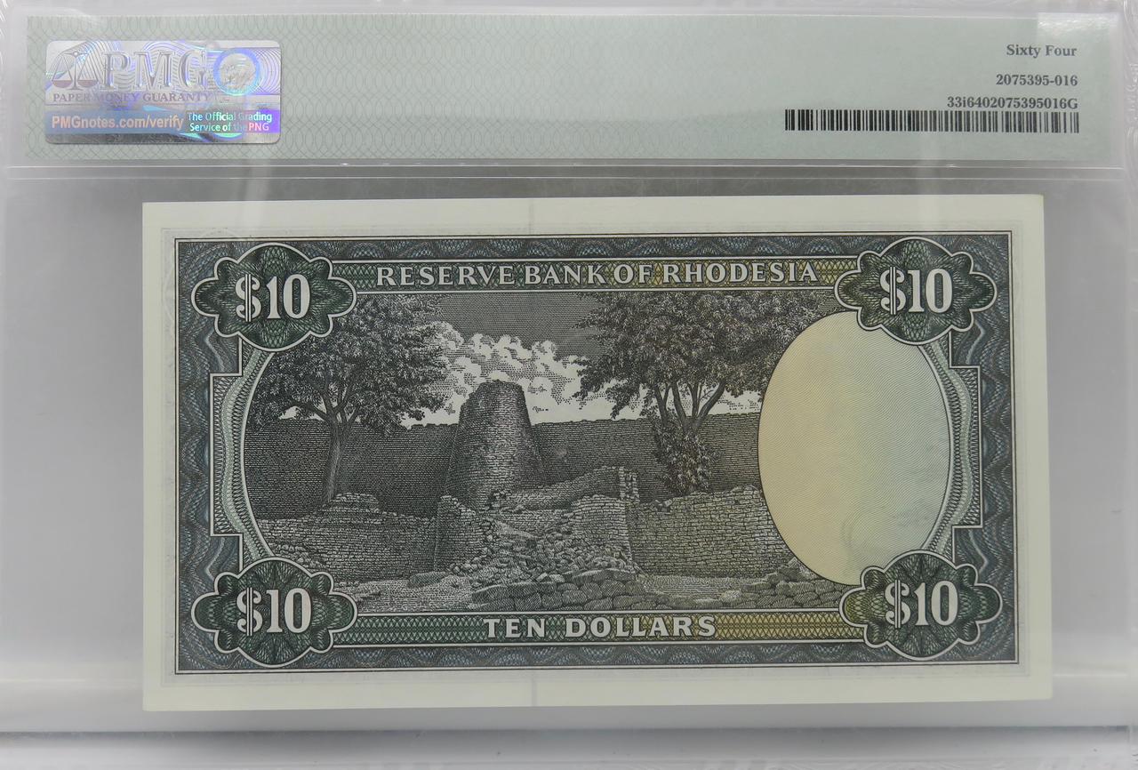 Lot 5: Rhodesia: Reserve Bank of Rhodesia Ten Dollars Note of 1975 PMG Graded 64 Choice Uncirculated.