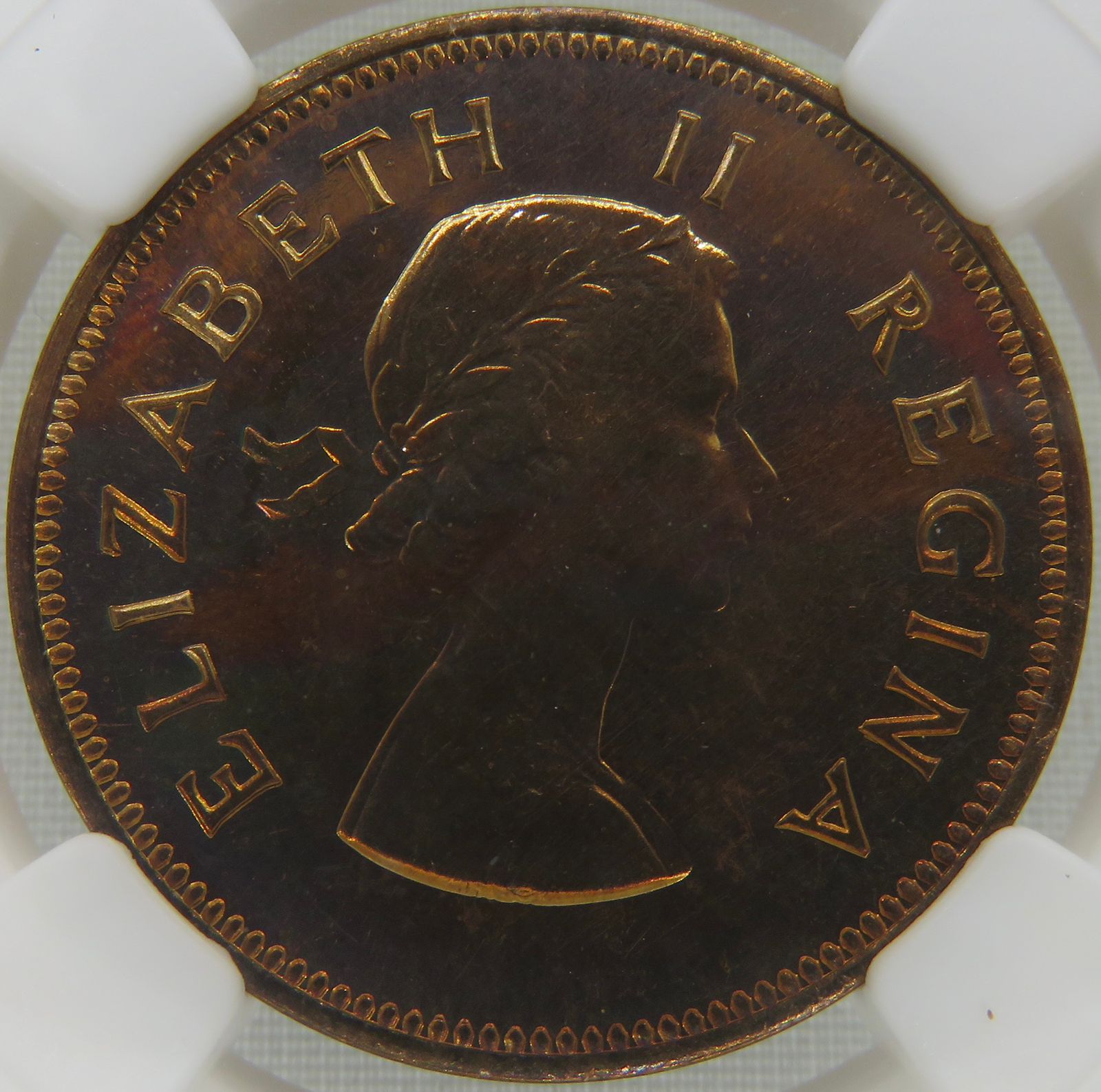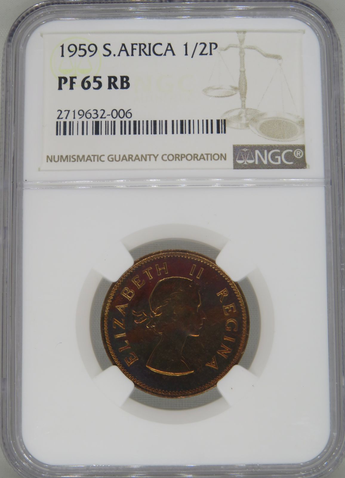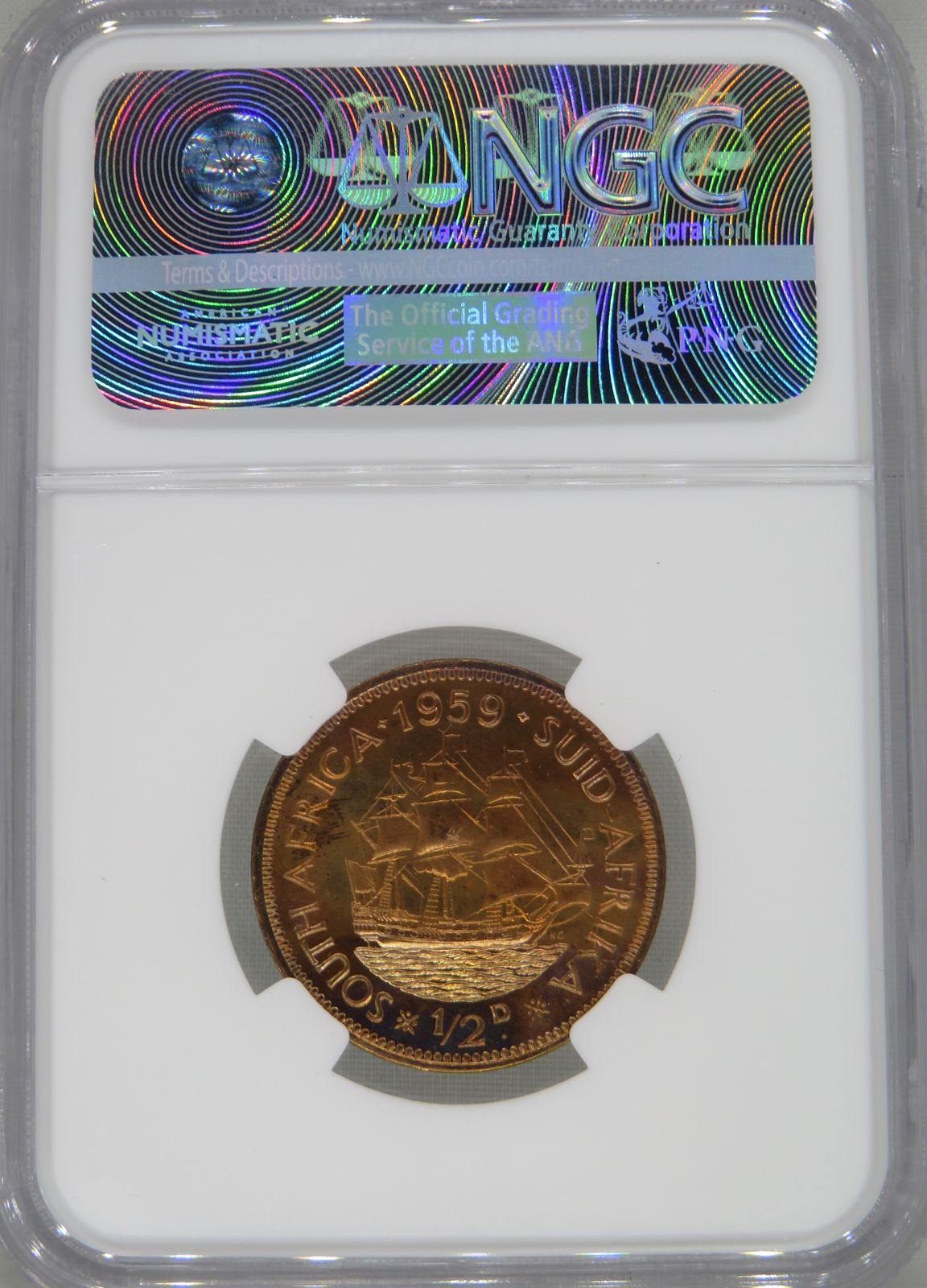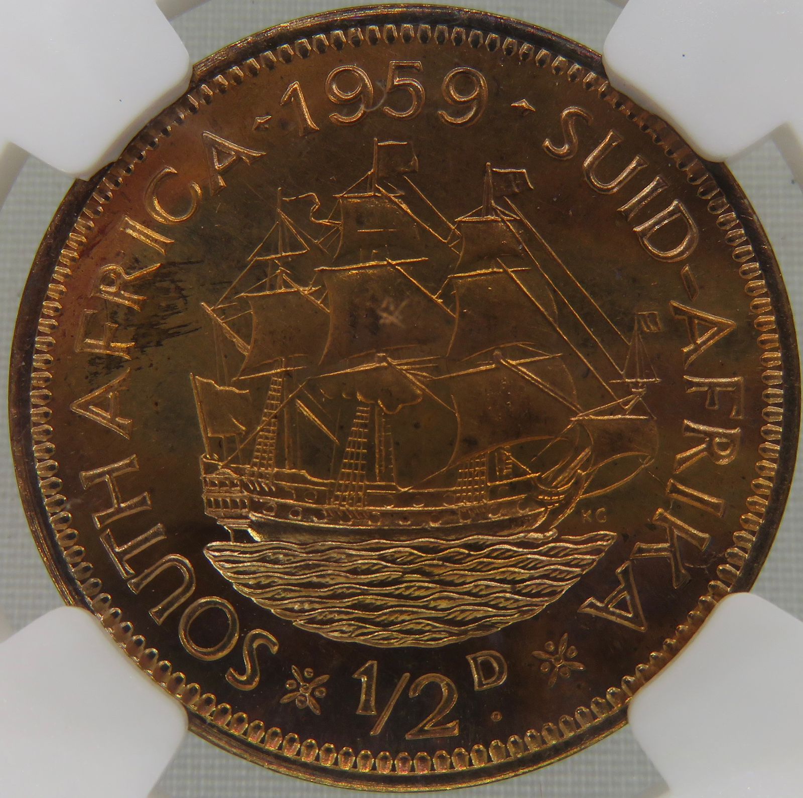 Lot 5: South Africa: Union Elizabeth II bronze half penny of 1959 Proof 65 Red & Brown NGC.