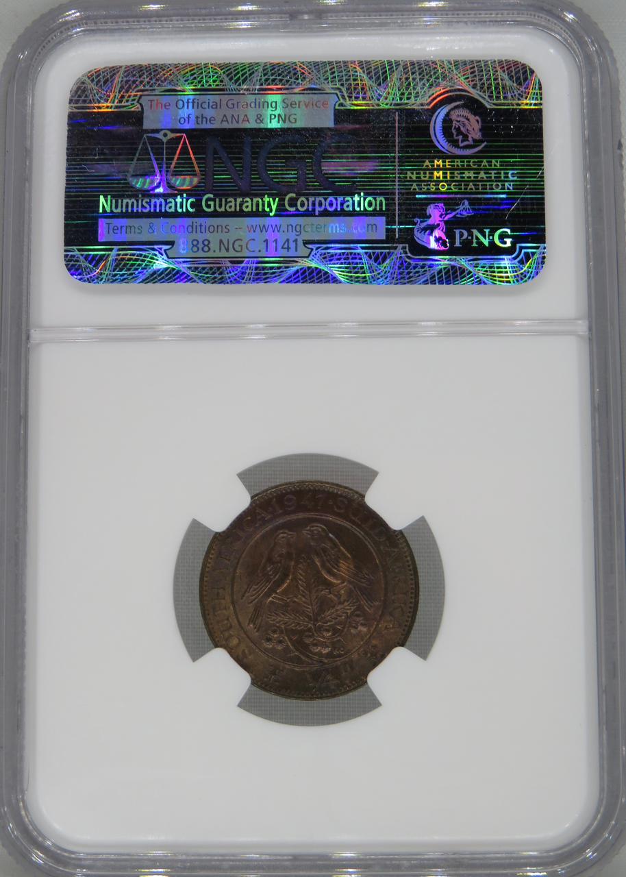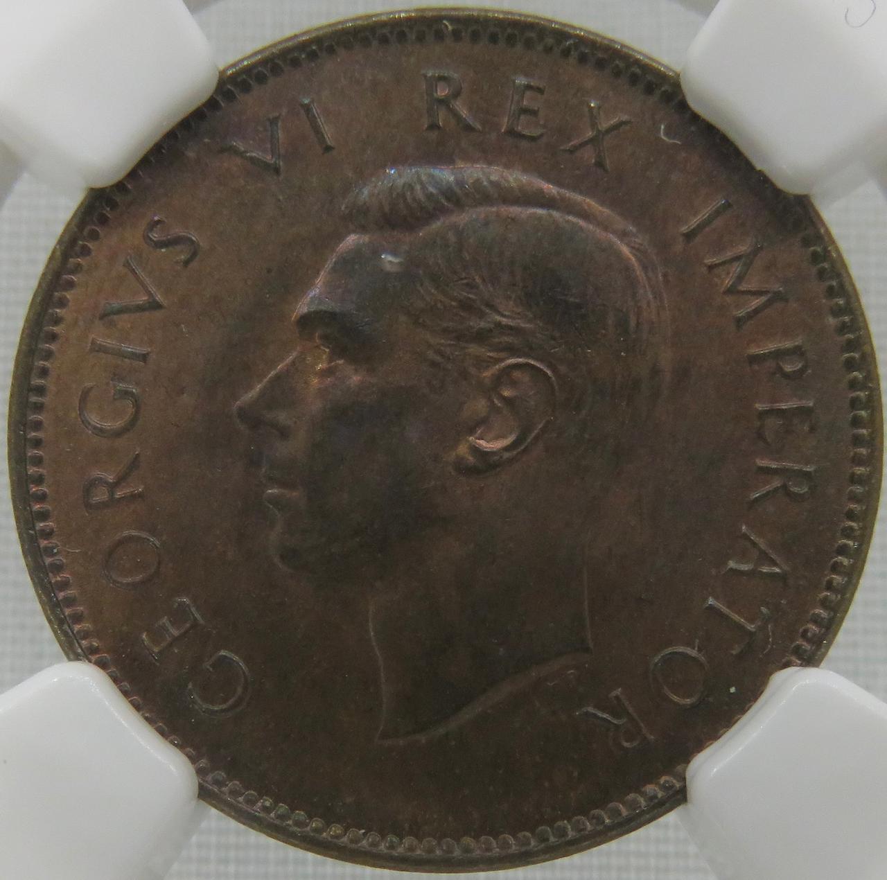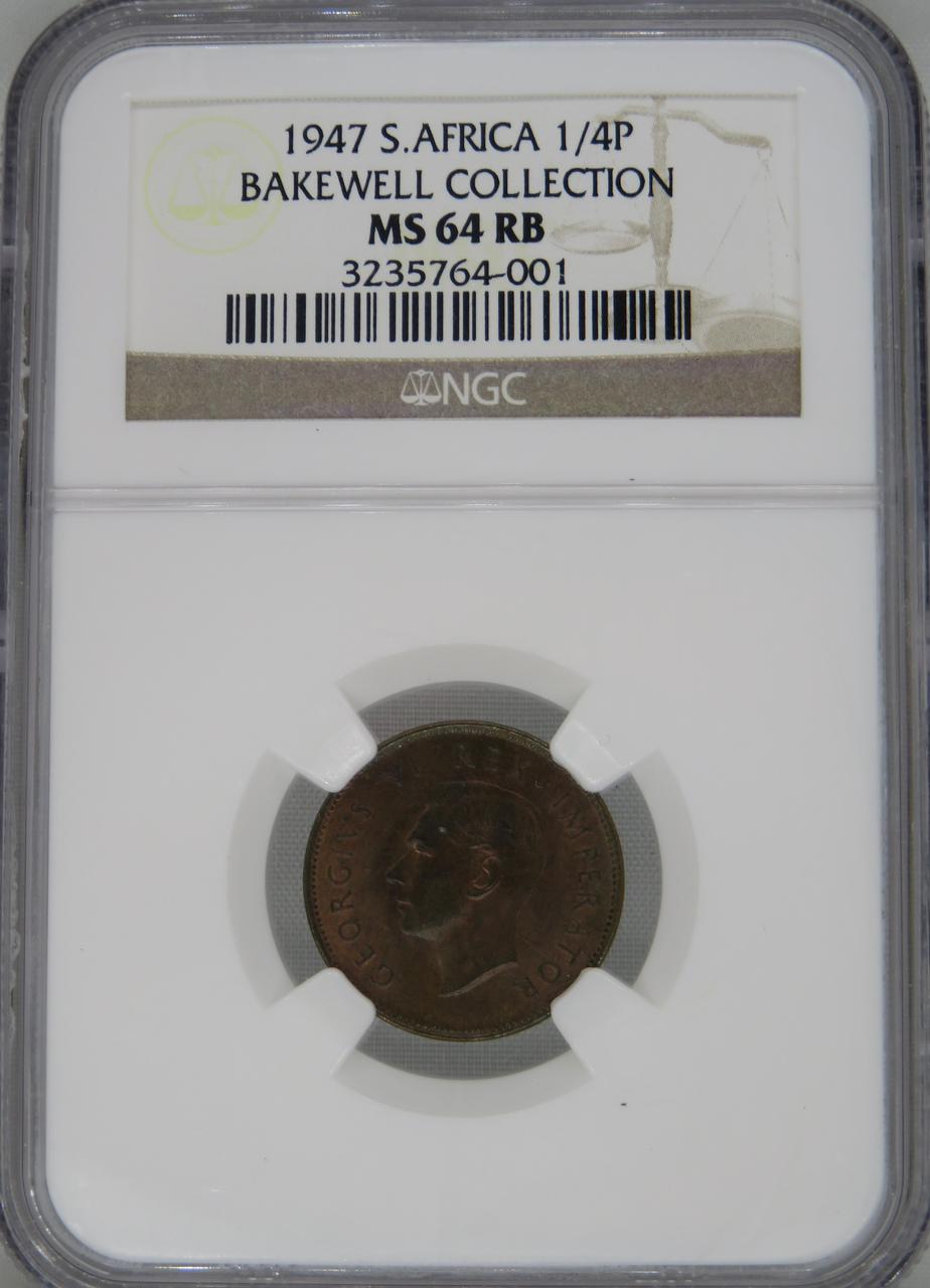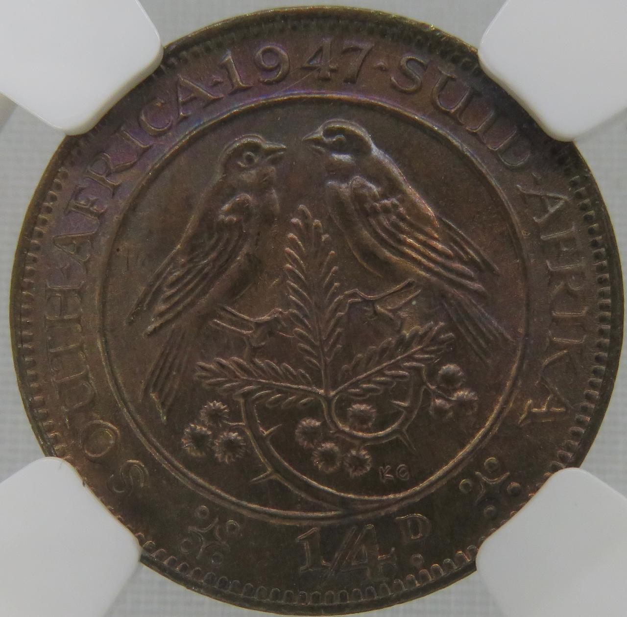 Lot 5: South Africa: Union George VI bronze quarter penny (farthing) of 1947 MS 64 Red & Brown NGC.