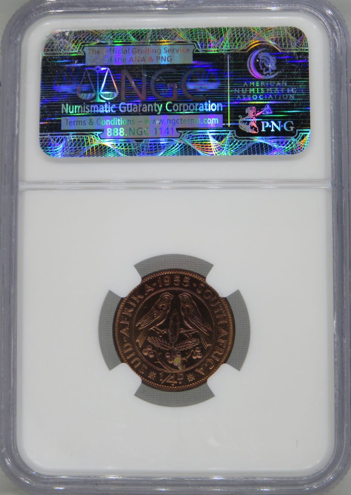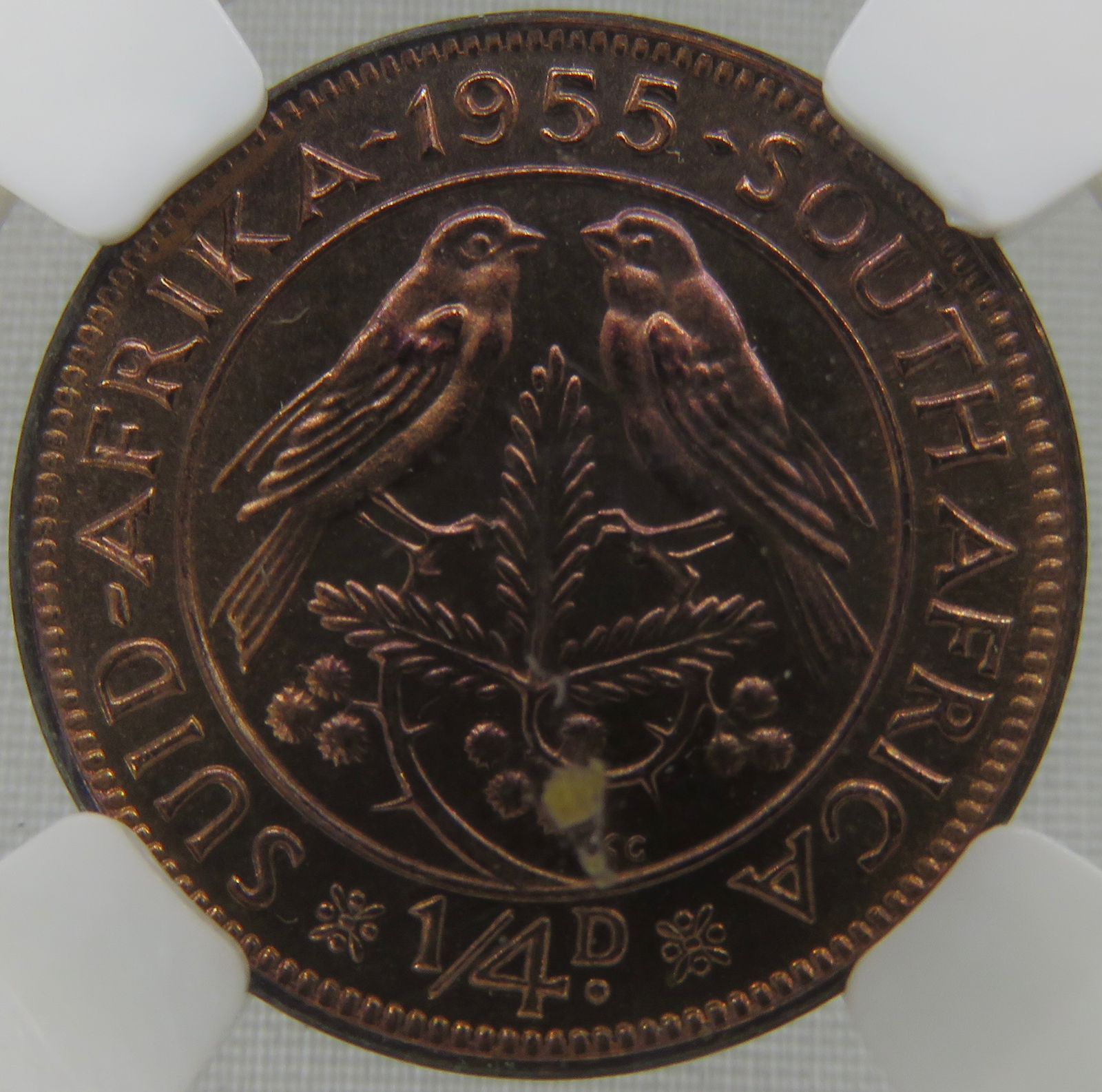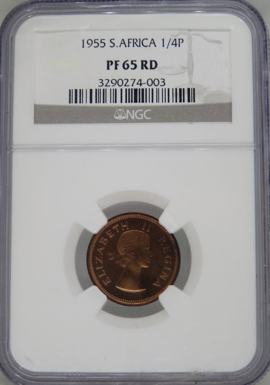 Lot 6: South Africa: Union Elizabeth II bronze 1/4 Penny of 1955 Proof 65 Red NGC.