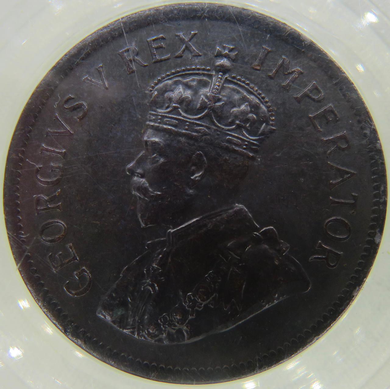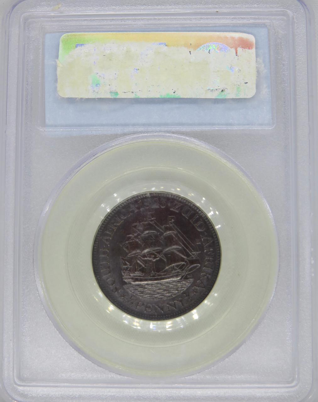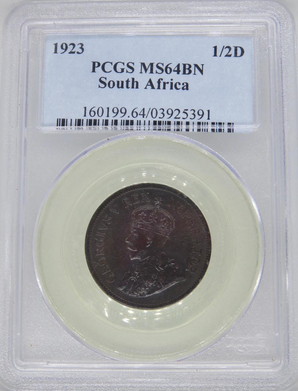Lot 6: South Africa: Union George V Half Penny of 1923 MS 64 Brown PCGS. Mintage: 12 080. Hern’s Price UNC: R1,400. 2nd Highest Grade @ PCGS with only 2 better. Sold @ R1,100.