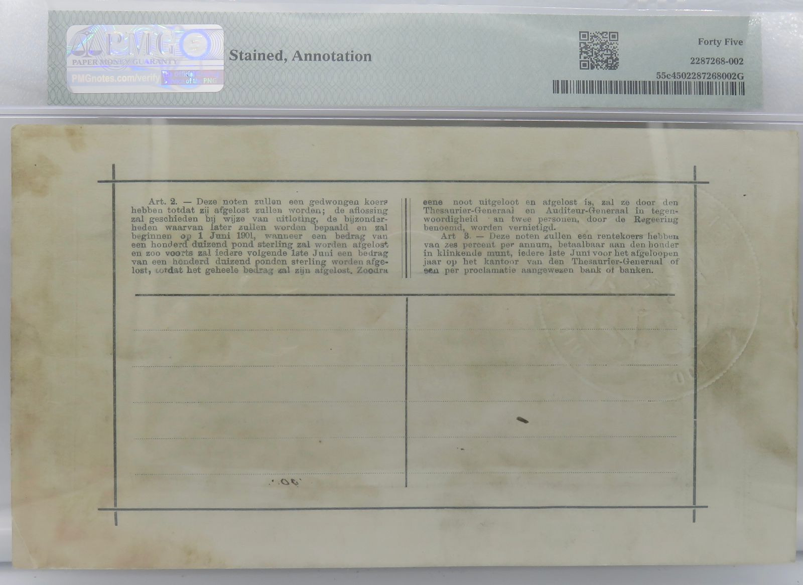 Lot 7: South Africa: Anglo Boer War Issues: ZAR VIJF Pond “Pretoria” Gouvernements Noot of 1900 PMG Choice Extremely Fine 45.