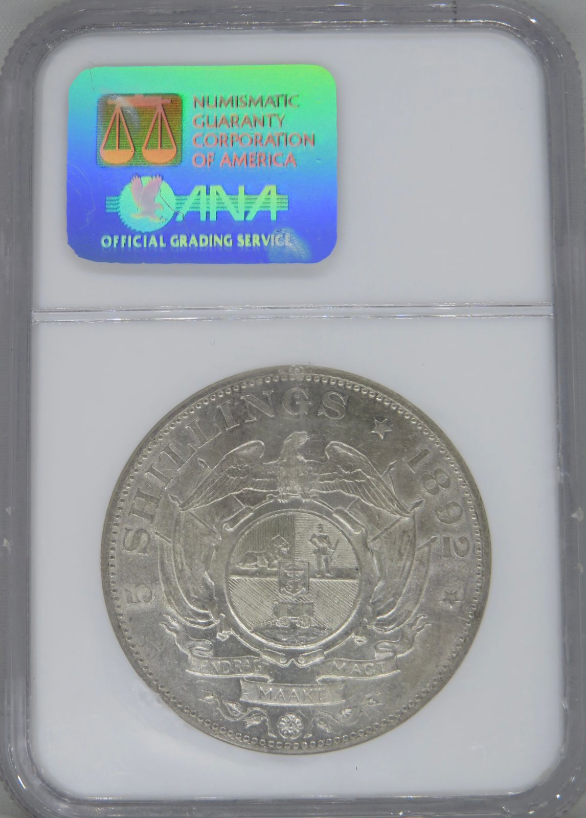 South Africa: Paul Kruger ZAR silver 5 Shillings (crown) “Single Shaft” of 1892 AU 55 NGC.
