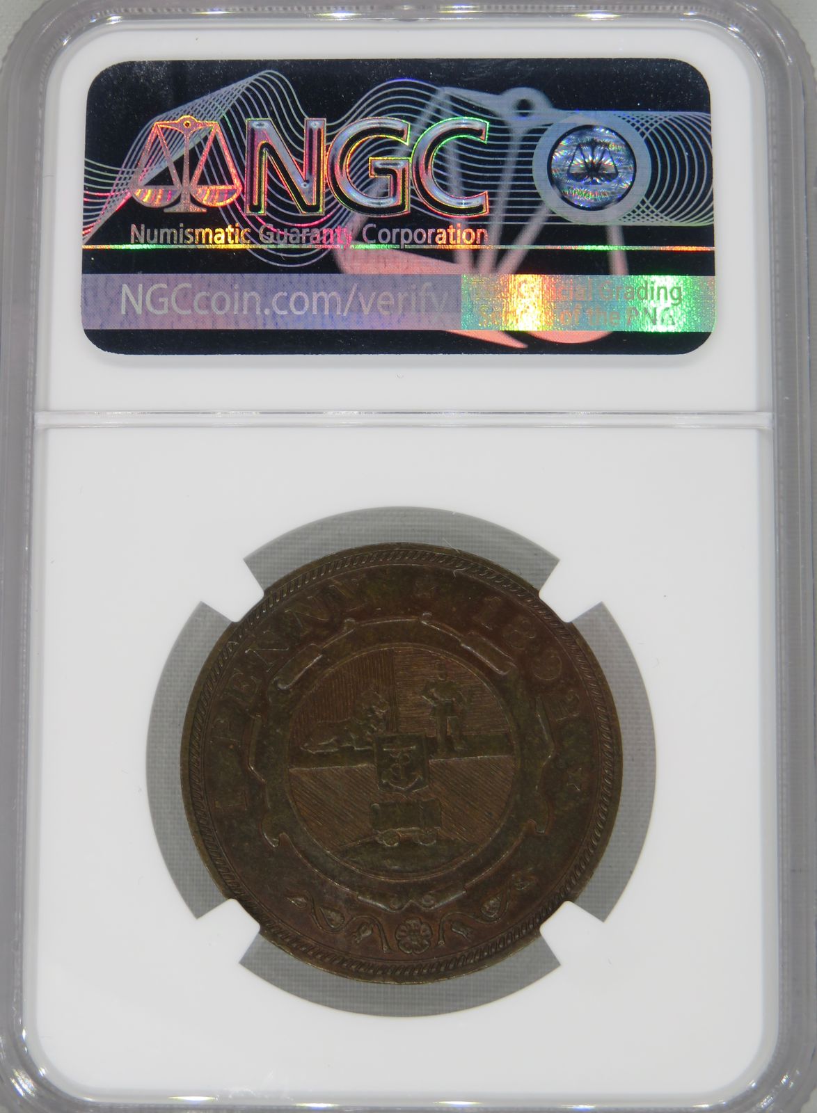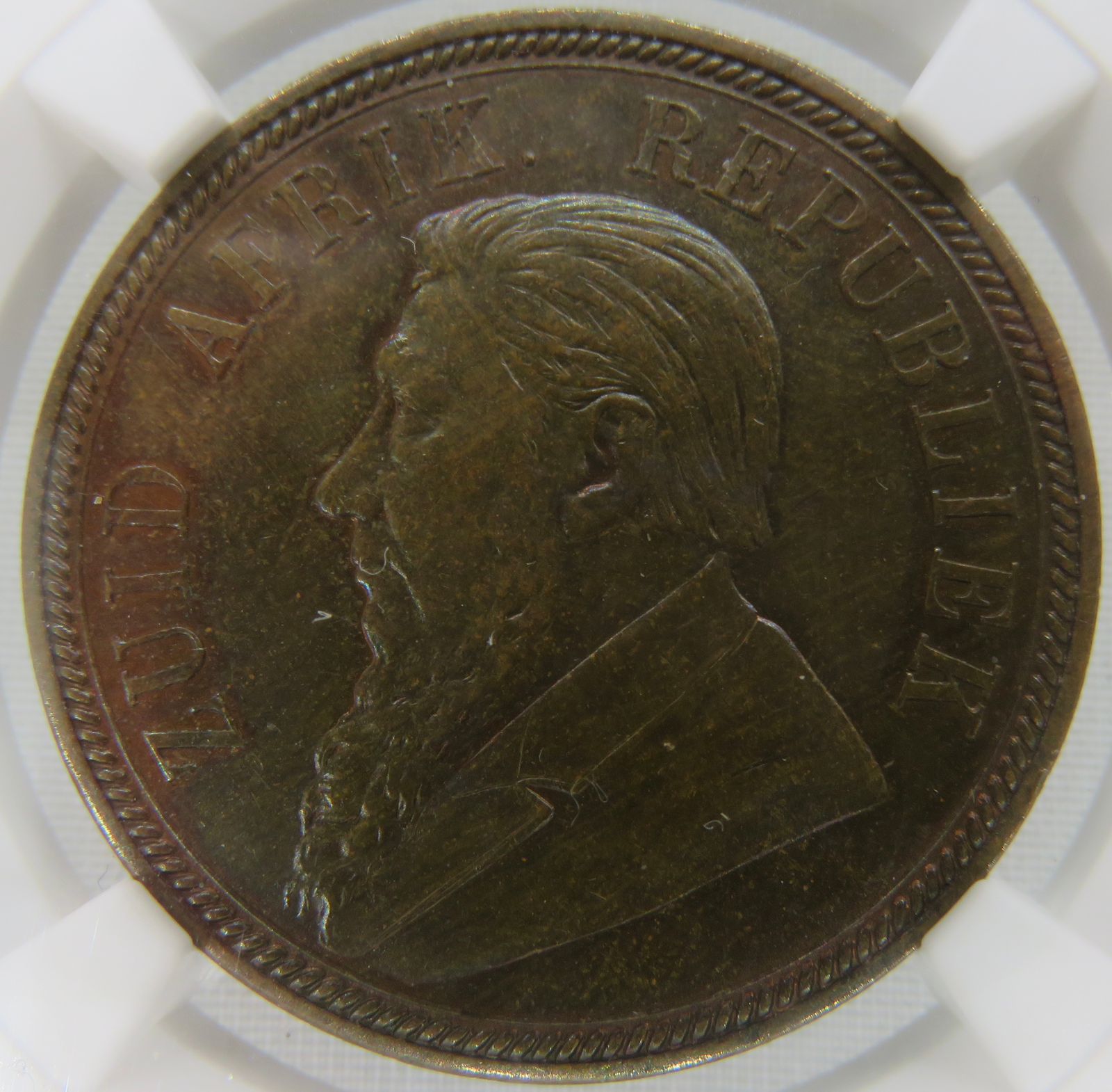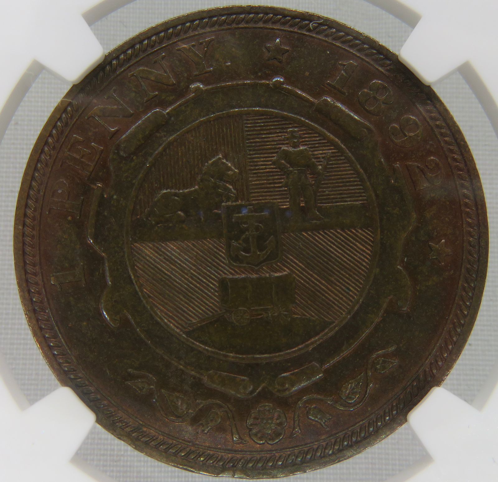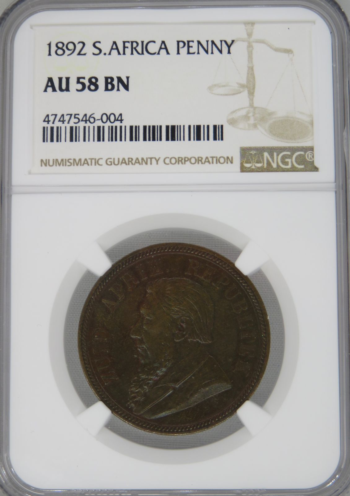 South Africa: ZAR Bronze Penny of 1892 AU 58 Brown NGC.