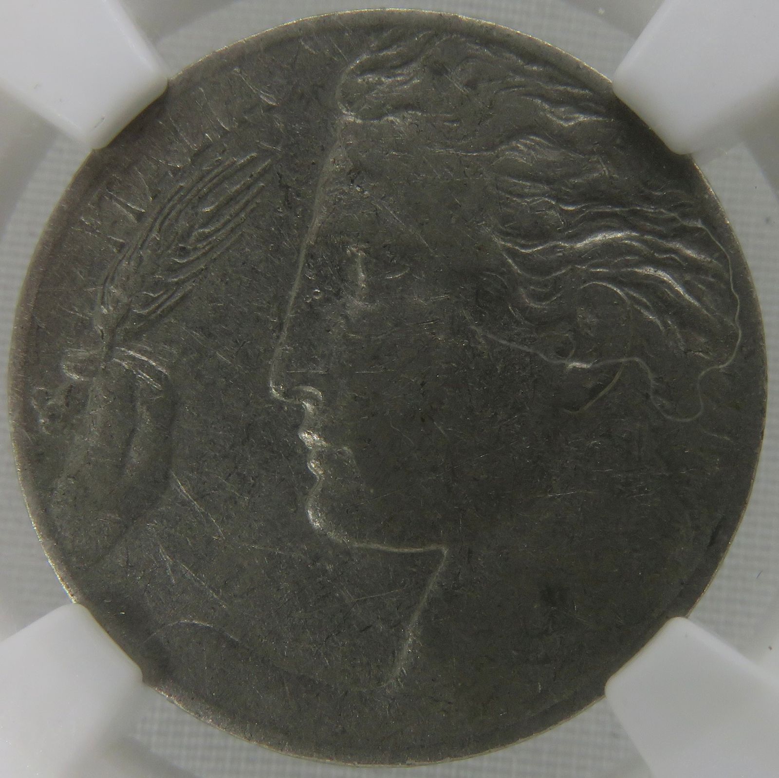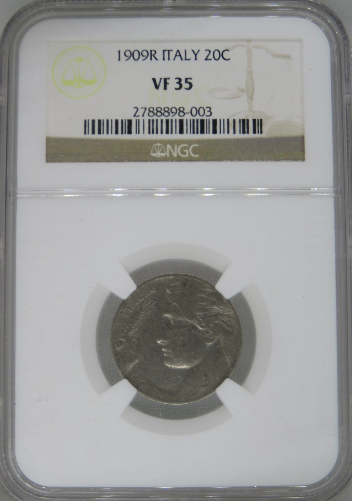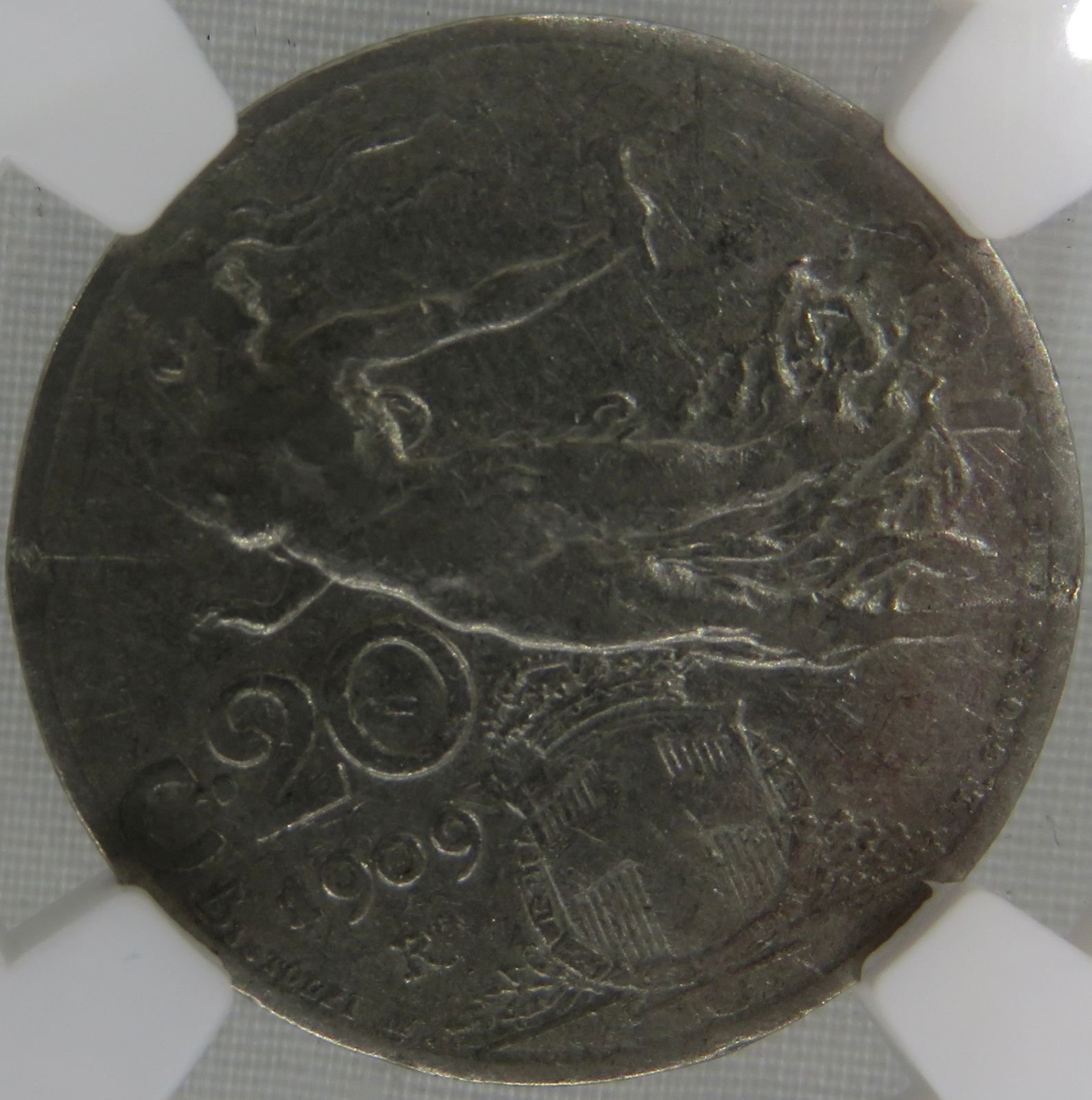 Lot 8: Italy: Victor Emmanuel III nickel 20 centesimi of 1909 VF 35 NGC. Mintage: 19,280,000. Rome Mint. Sold @ R125.