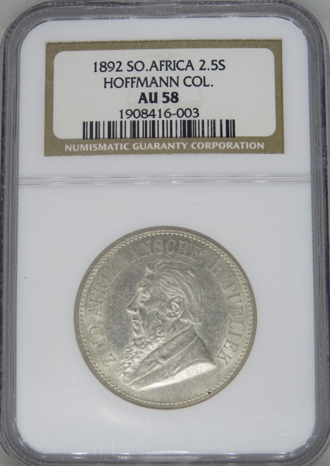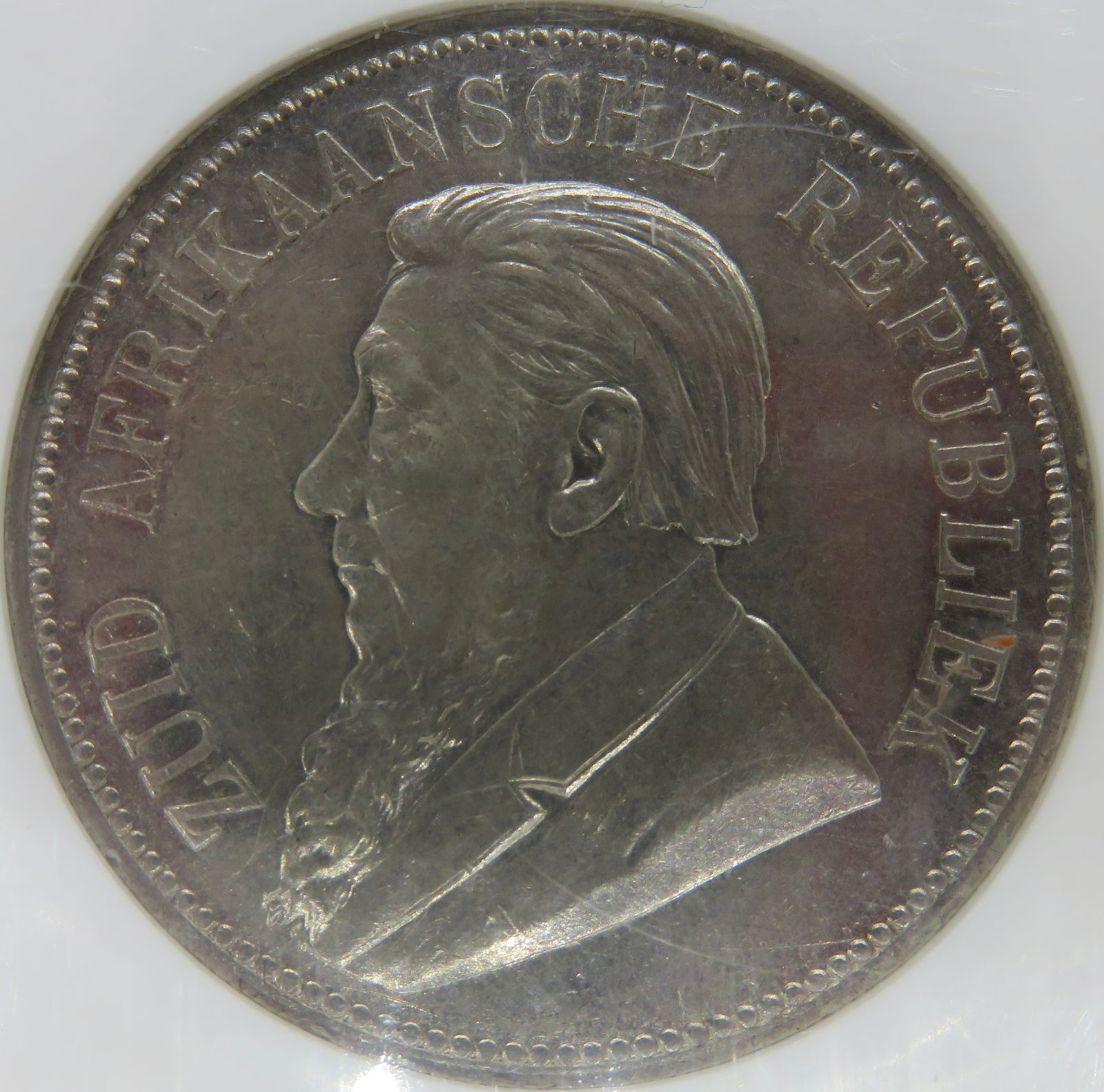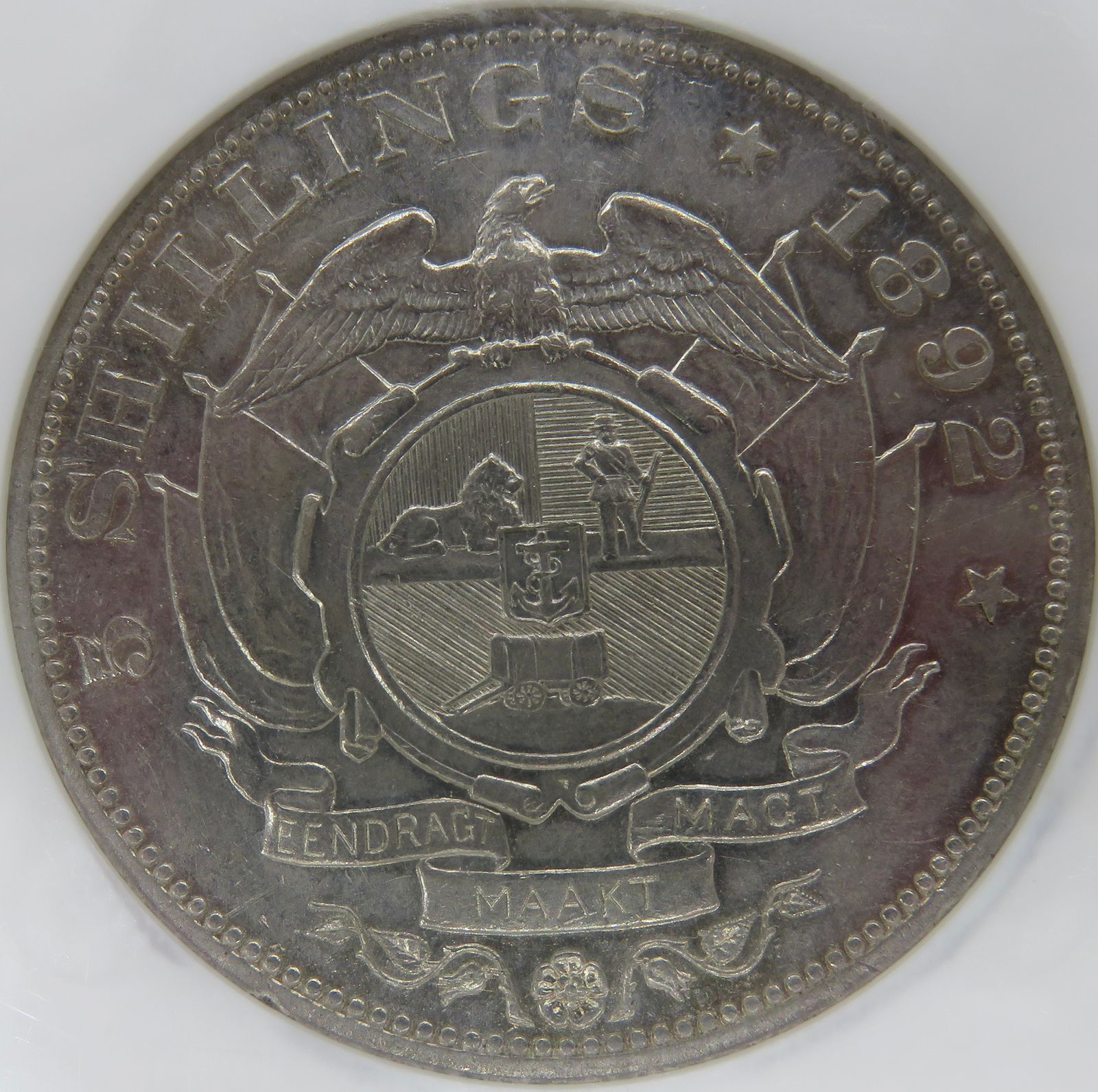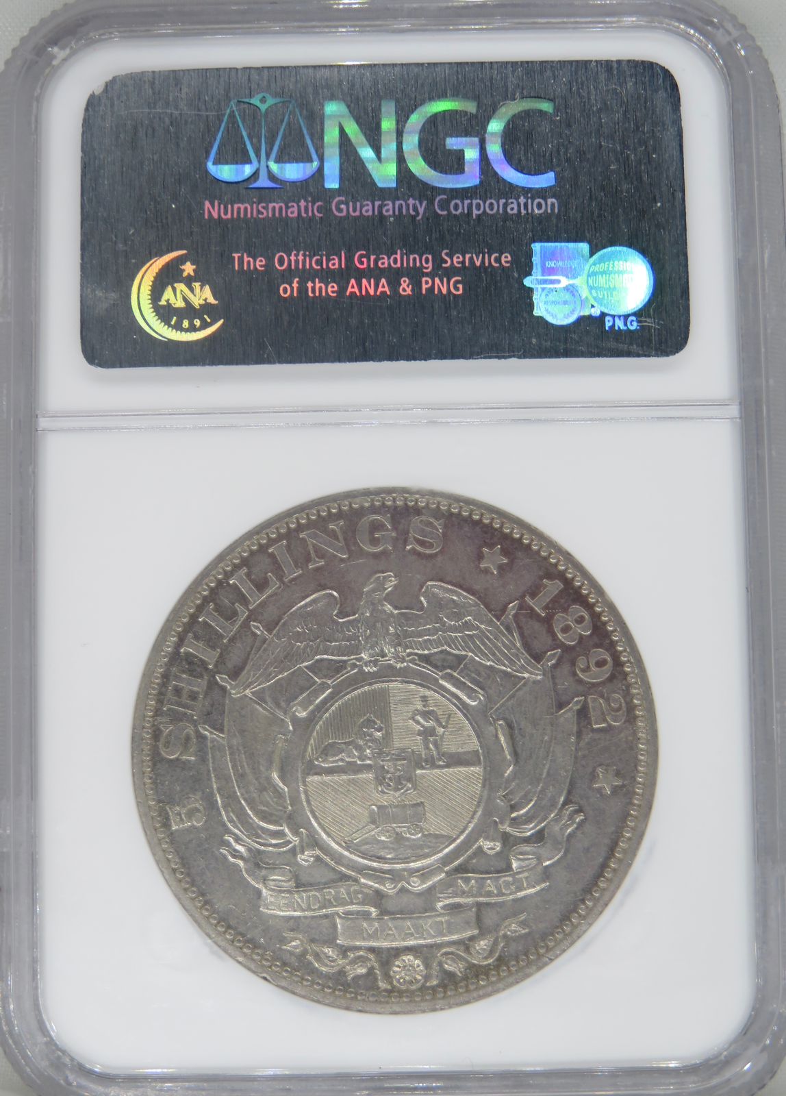 Lot 8: South Africa: Paul Kruger ZAR silver 5 Shillings (crown) “Double Shaft” of 1892 AU 55 NGC.