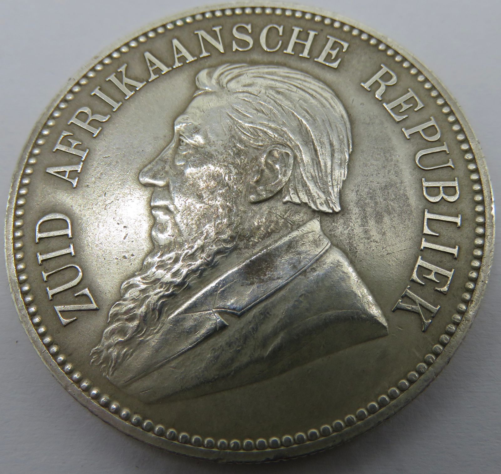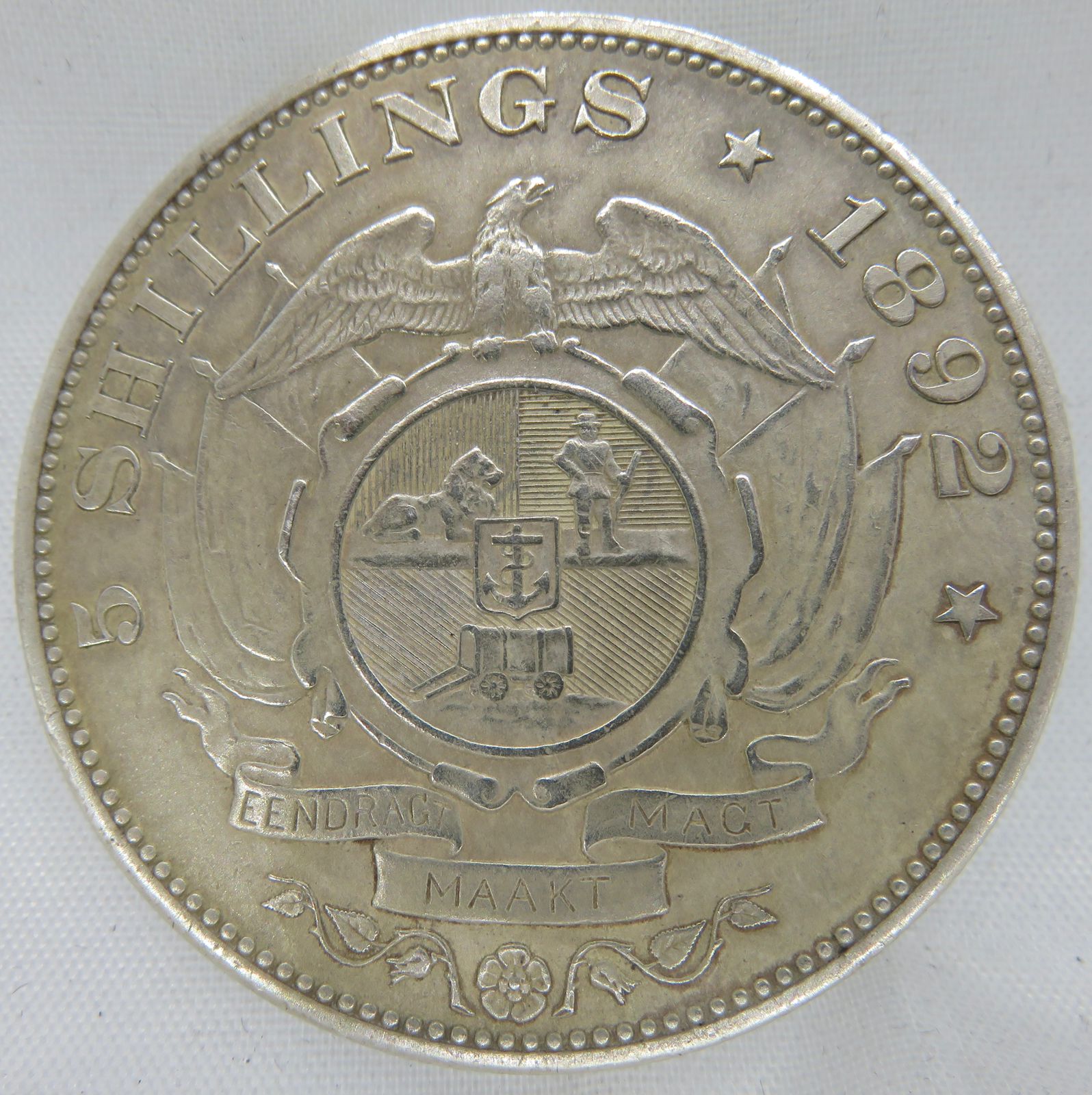 South Africa: Paul Kruger ZAR Silver 5 Shillings “Double Shaft” of 1892 in AU Condition.