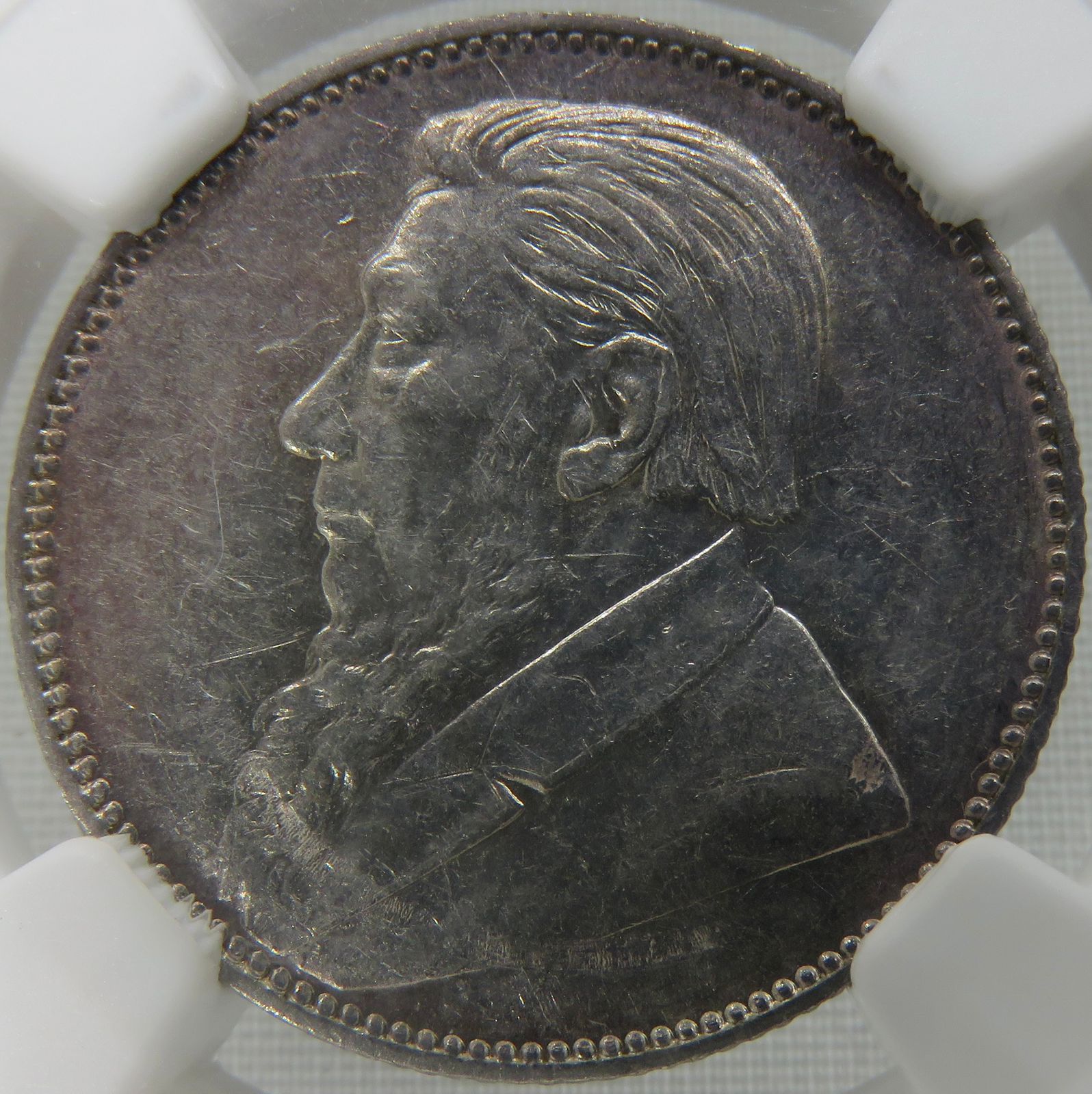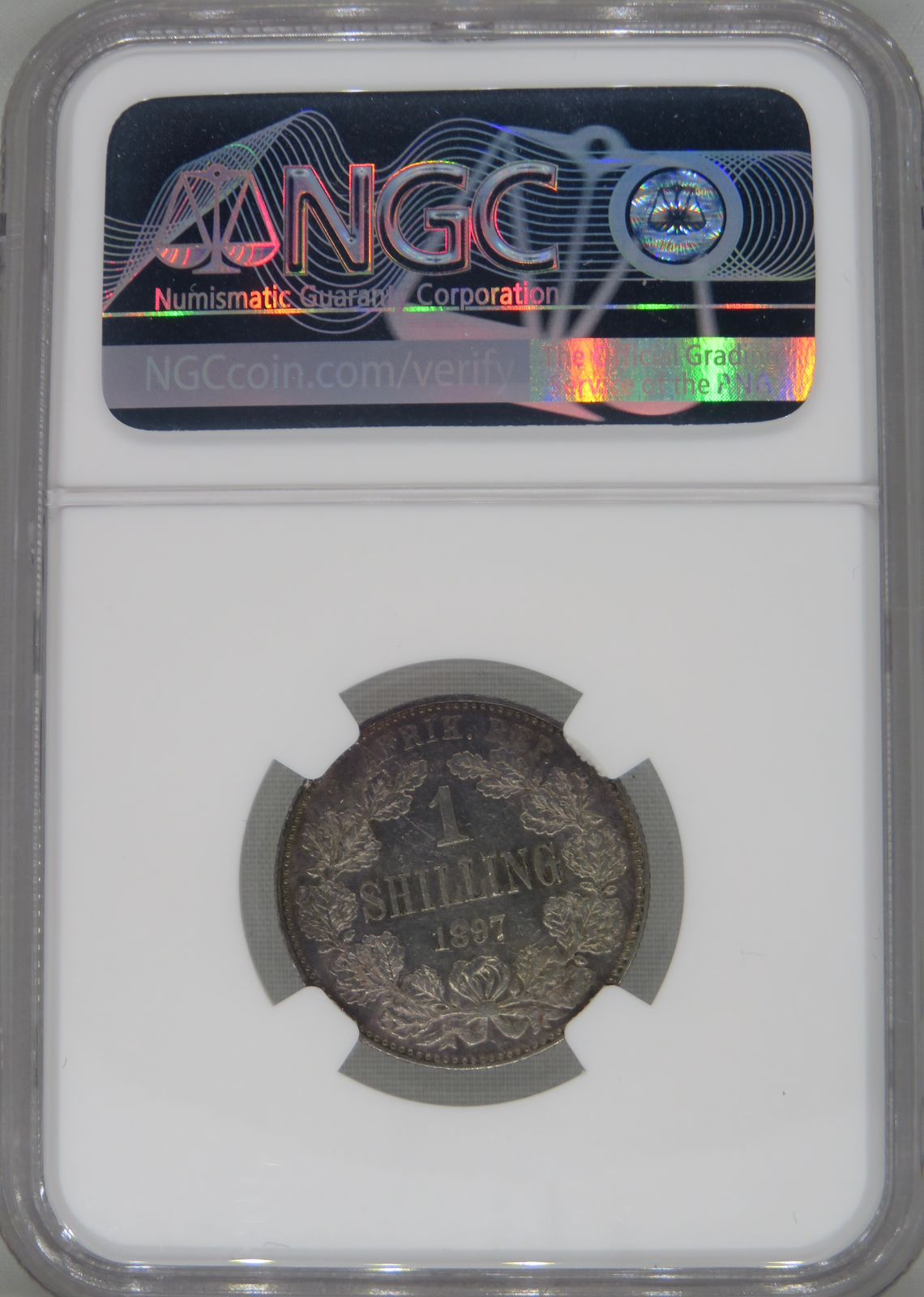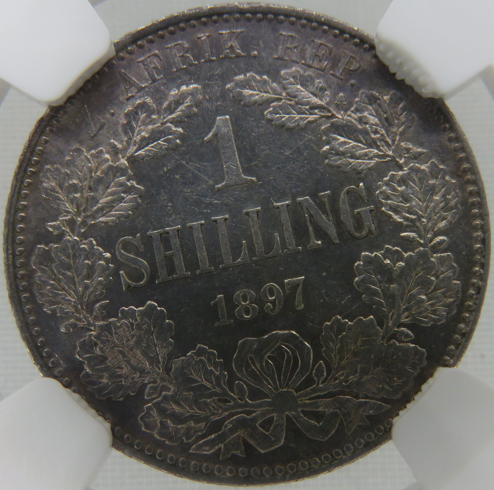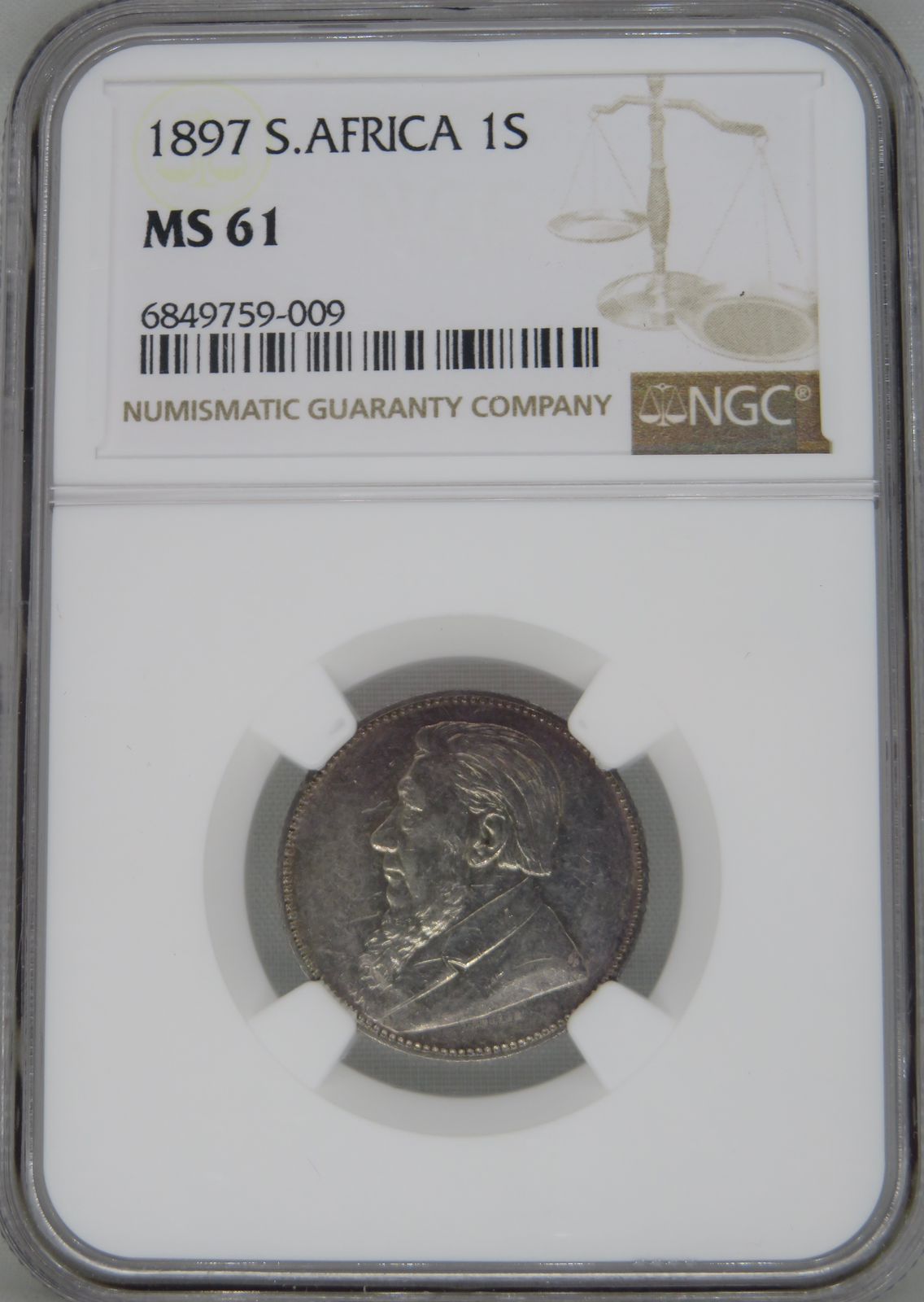 Lot 8: South Africa: Paul Kruger ZAR silver One Shilling of 1897 MS 61 NGC. Mintage: 397 300. Perfect uncirculated. Hern’s Price UNC: R2,000. Sold @ R1,000.